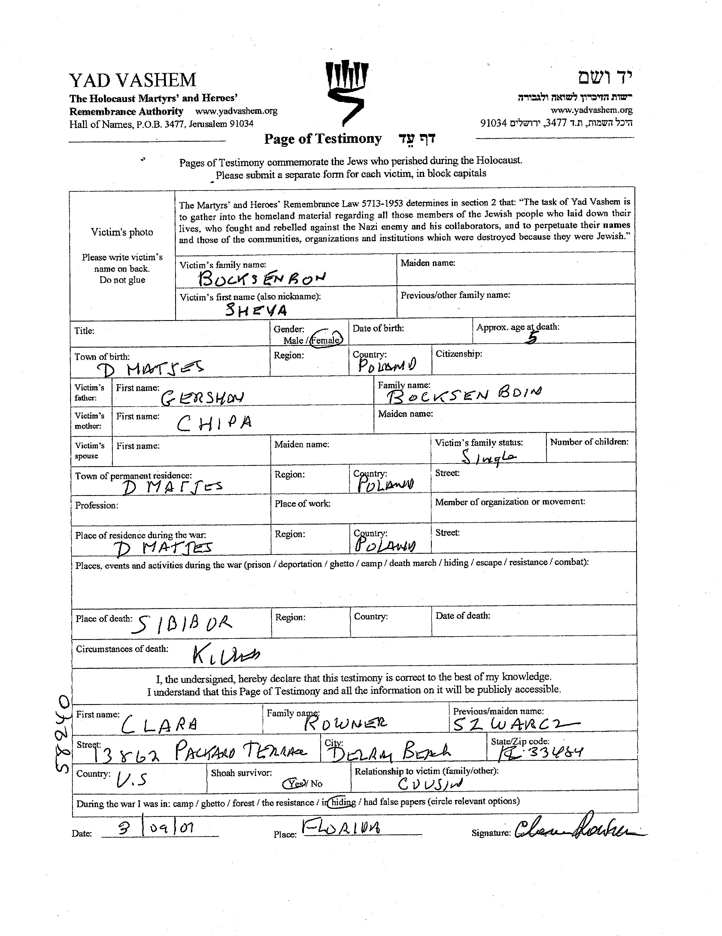 Sheva wurde in der Schoah ermordet. Todesort: Sobibor, Polen.