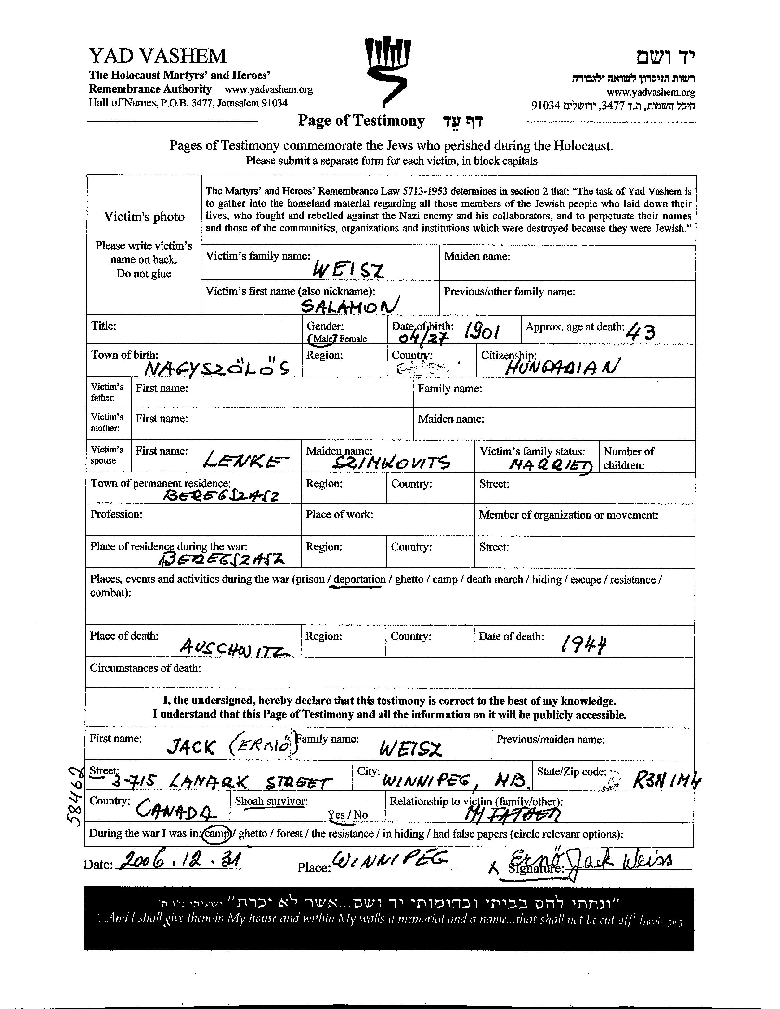 Salamon wurde in der Schoah ermordet. Todesort: Auschwitz, Polen im Jahr 1944.