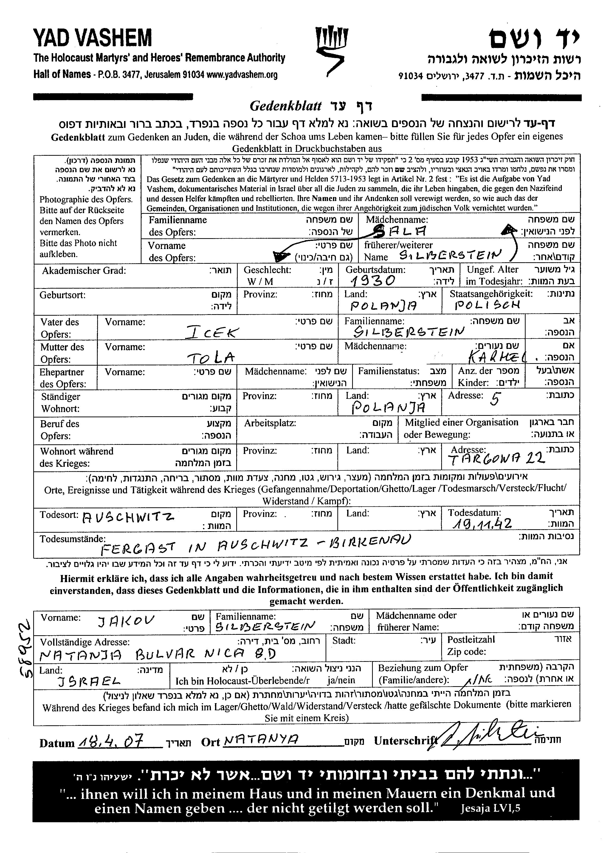 Sala Silberstein wurde im Jahr 1930 in Polen geboren. Sie war die Tochter von Icek und Tola, geb. Karmel. Vor dem Zweiten Weltkrieg lebte sie in Polen. Während des Krieges war sie in Polen.