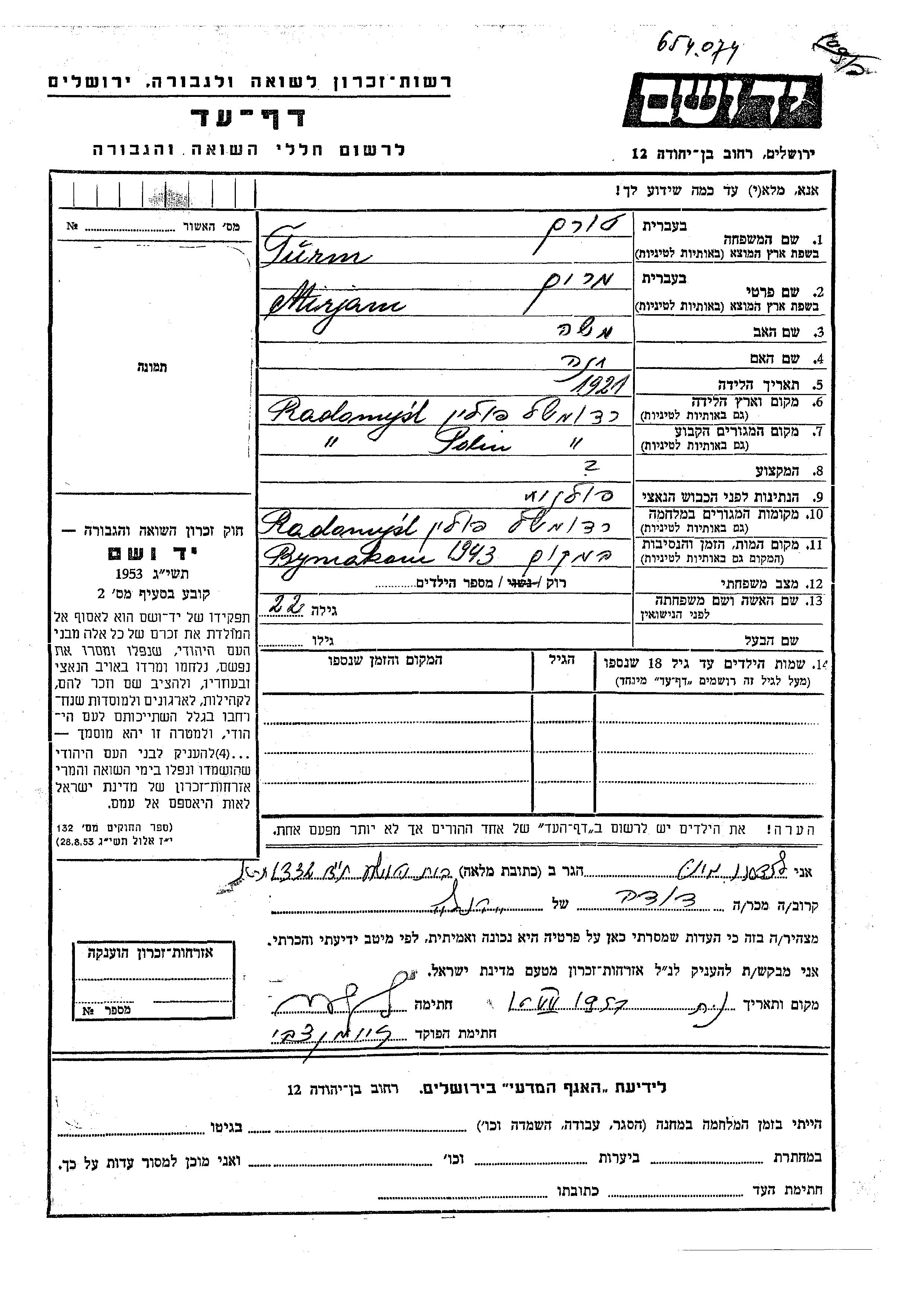 Mirjam Turm wurde im Jahr 1921 in Radomishl, Polen geboren. Sie war die Tochter von Moshe und Khana. Sie war Ledig. Vor dem Zweiten Weltkrieg lebte sie in Radomishl, Polen. Während des Krieges war sie in Radomishl, Polen.