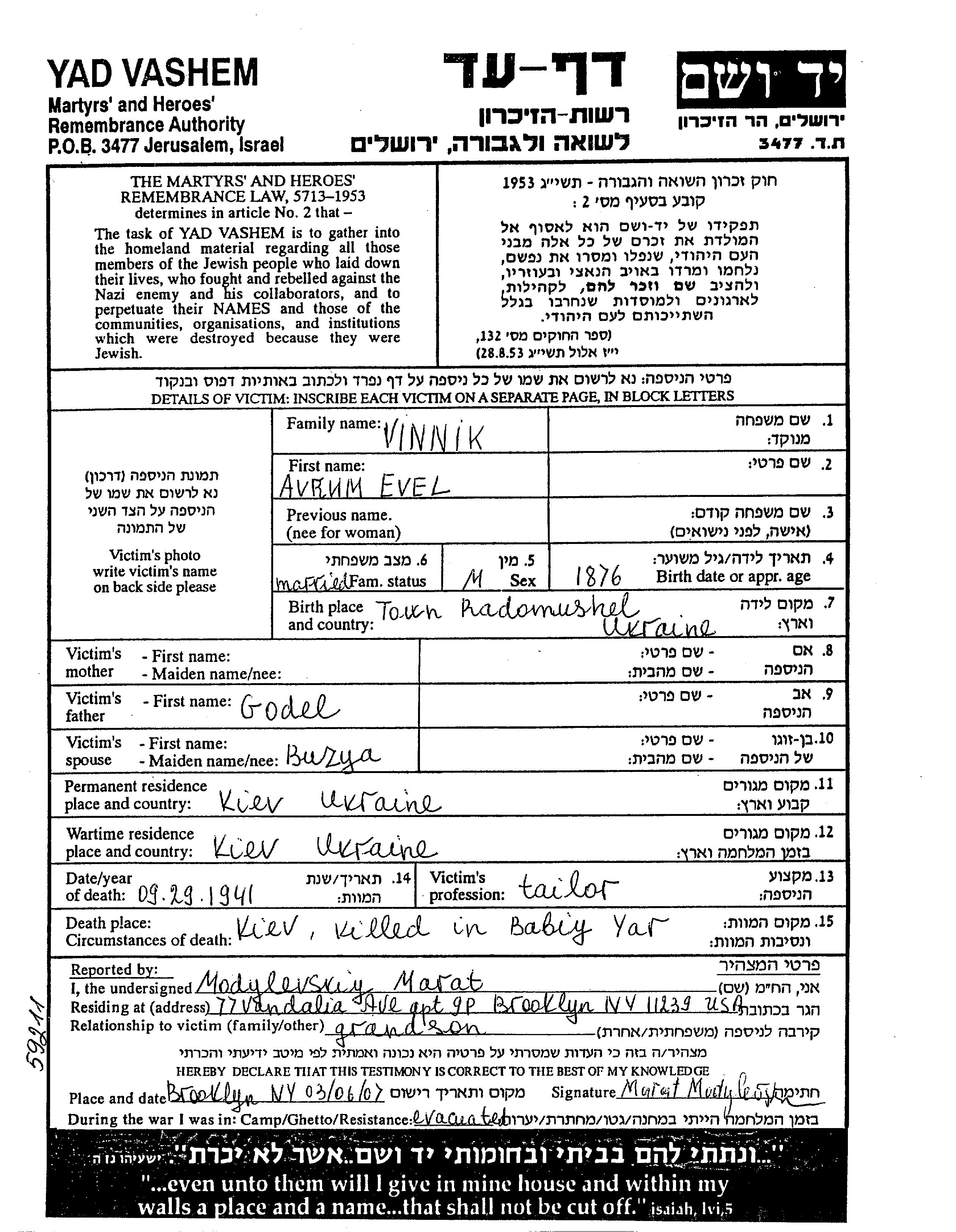 Evel Avrum Vinnik wurde im Jahr 1876 in Radomysl, Polen geboren. Er war der Sohn von Godel. Er war Schneider und mit Buzya Verheiratet. Vor dem Zweiten Weltkrieg lebte er in Kiev, Ukraine (UdSSR). Während des Krieges war er in Kiev, Ukraine (UdSSR).
