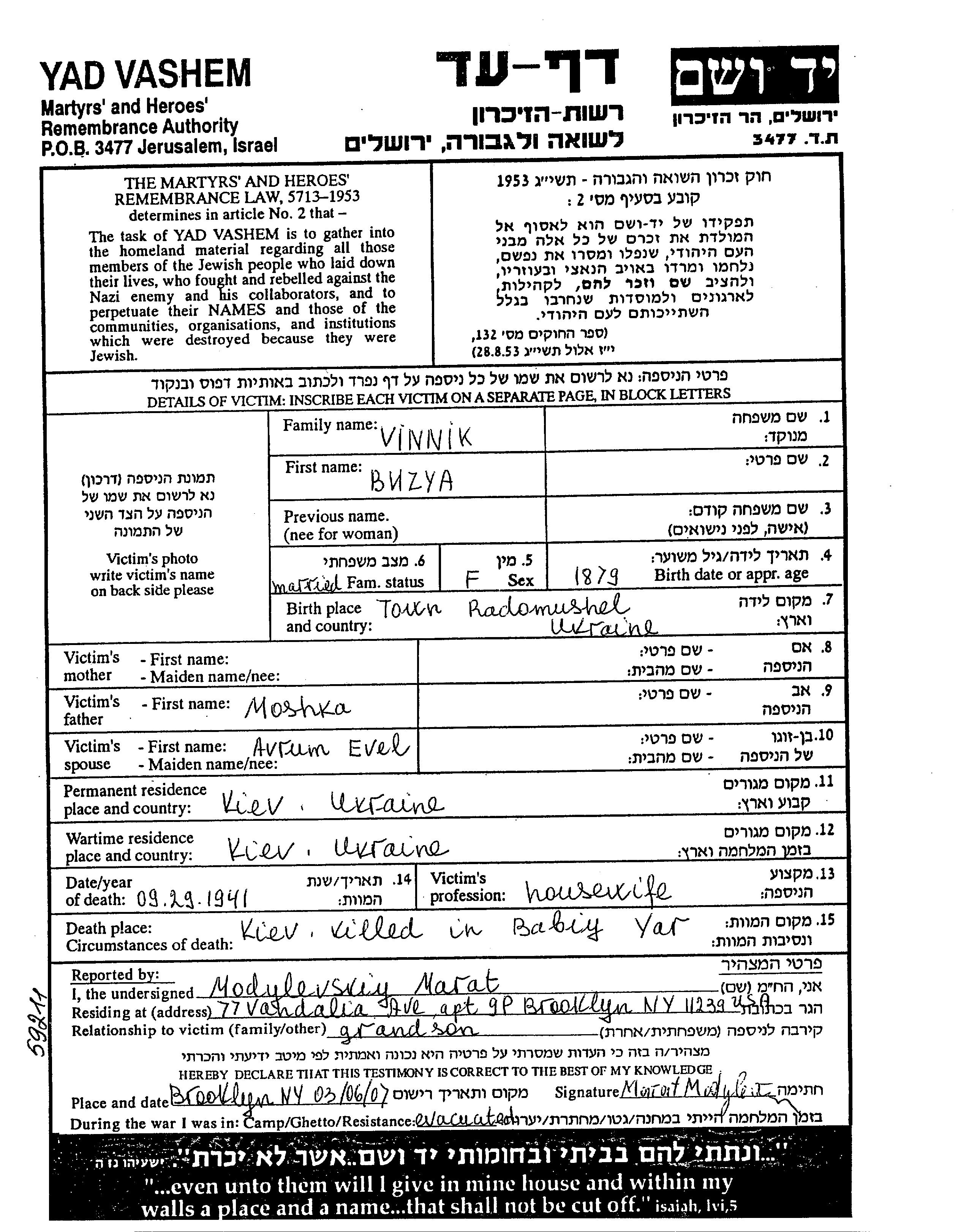 Buzya Vinnik wurde im Jahr 1879 in Radomysl, Polen geboren. Sie war die Tochter von Moshka. Sie war Hausfrau und mit Evel Avrum Verheiratet. Vor dem Zweiten Weltkrieg lebte sie in Kiev, Ukraine (UdSSR). Während des Krieges war sie in Kiev, Ukraine (UdSSR).