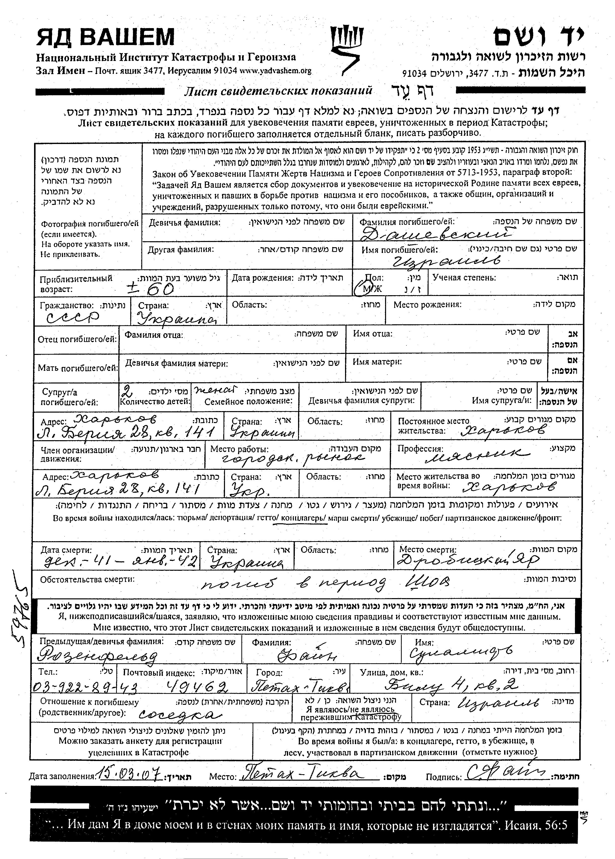 Izrail Dashevskiy wurde in Ukraine (UdSSR) geboren. Er war Metzger/-in und Verheiratet. Vor dem Zweiten Weltkrieg lebte er in Kharkov, Ukraine (UdSSR). Während des Krieges war er in Kharkov, Ukraine (UdSSR).