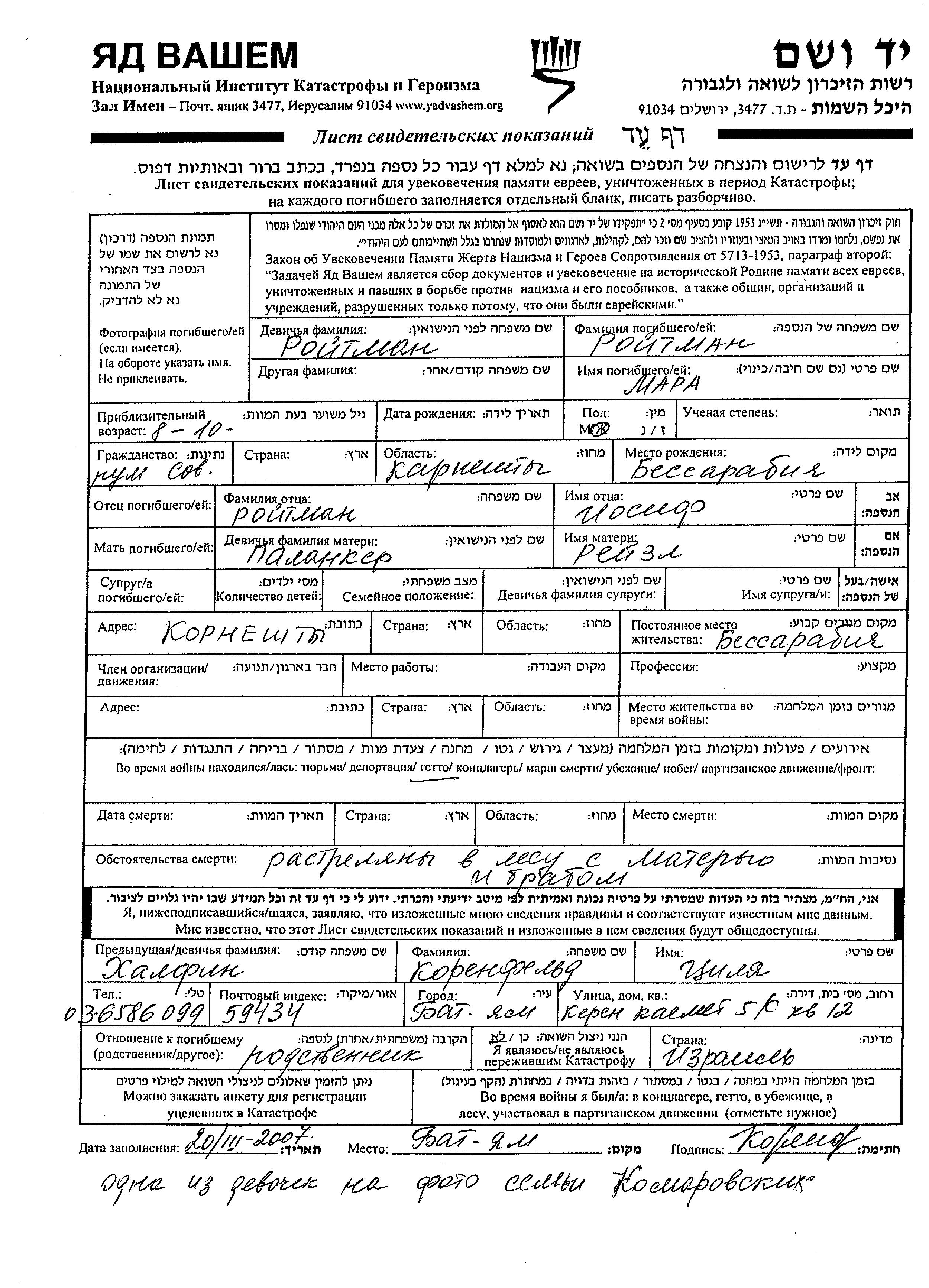 Roitman Mara Korneshty, Rumänien Gedenkblatt