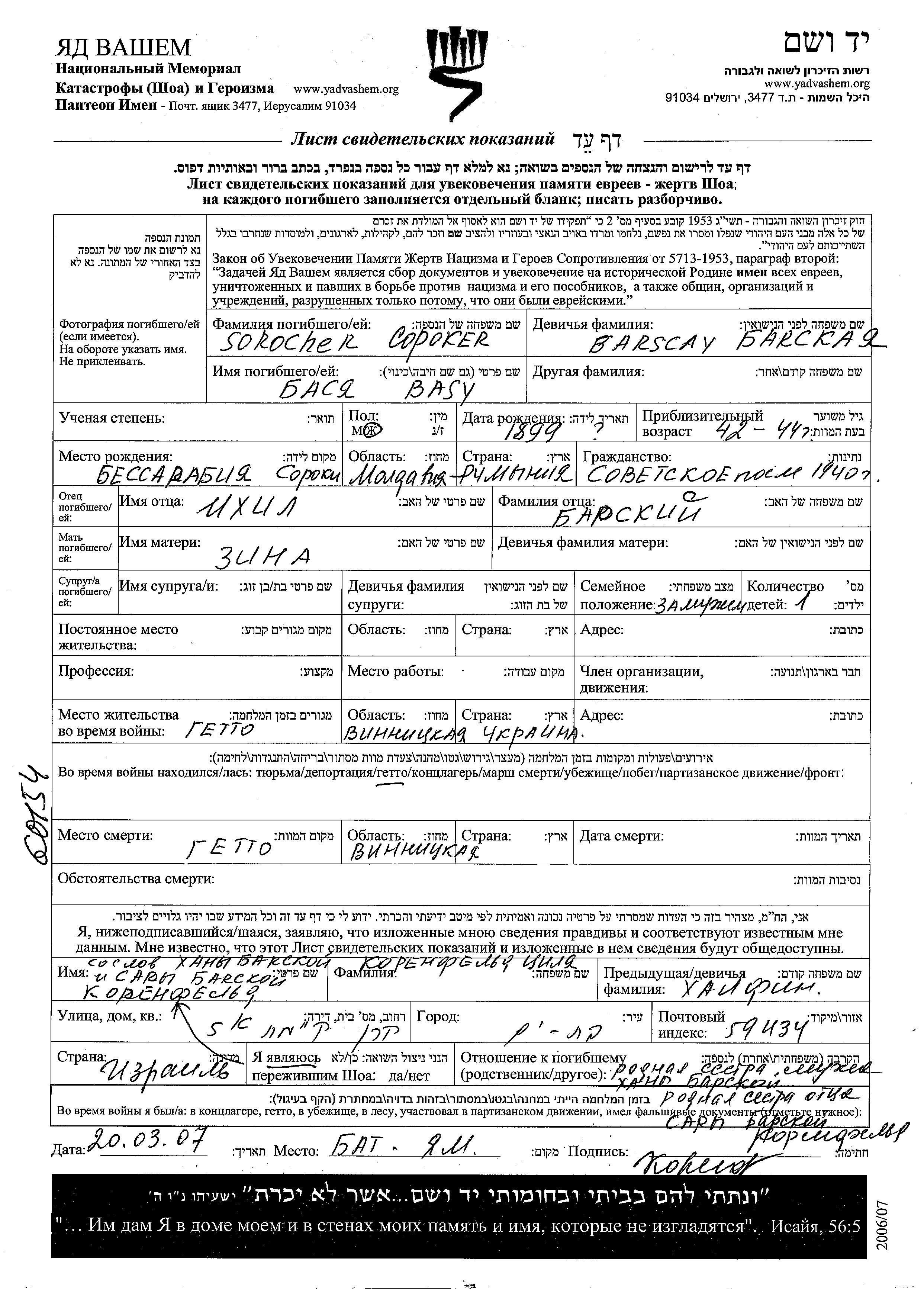 Basya Sorocher, geb. Barscay wurde im Jahr 1899 in Soroki, Rumänien geboren. Sie war die Tochter von Ikhil und Zina. Sie war Verheiratet. Während des Krieges war sie in Vinnitsa, Ukraine (UdSSR).
