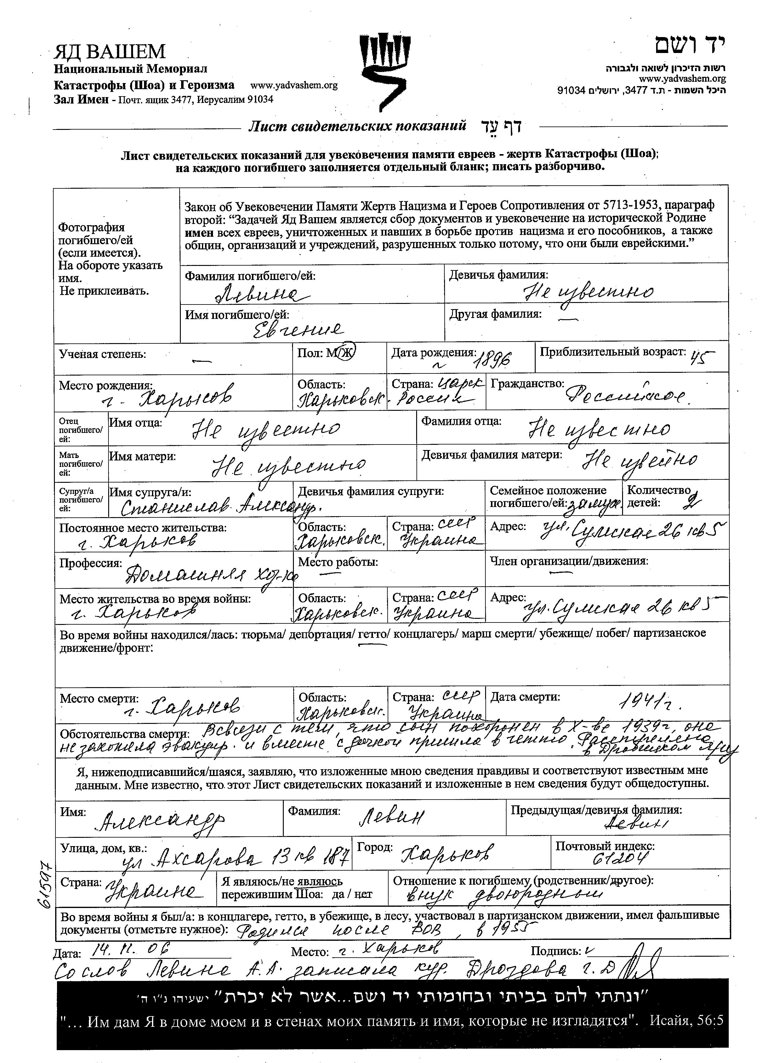 Evgenia Levina wurde im Jahr 1896 in Kharkov, Ukraine (UdSSR) geboren. Sie war Hausfrau und mit Stanislav Verheiratet. Vor dem Zweiten Weltkrieg lebte sie in Kharkov, Ukraine (UdSSR). Während des Krieges war sie in Kharkov, Ukraine (UdSSR).