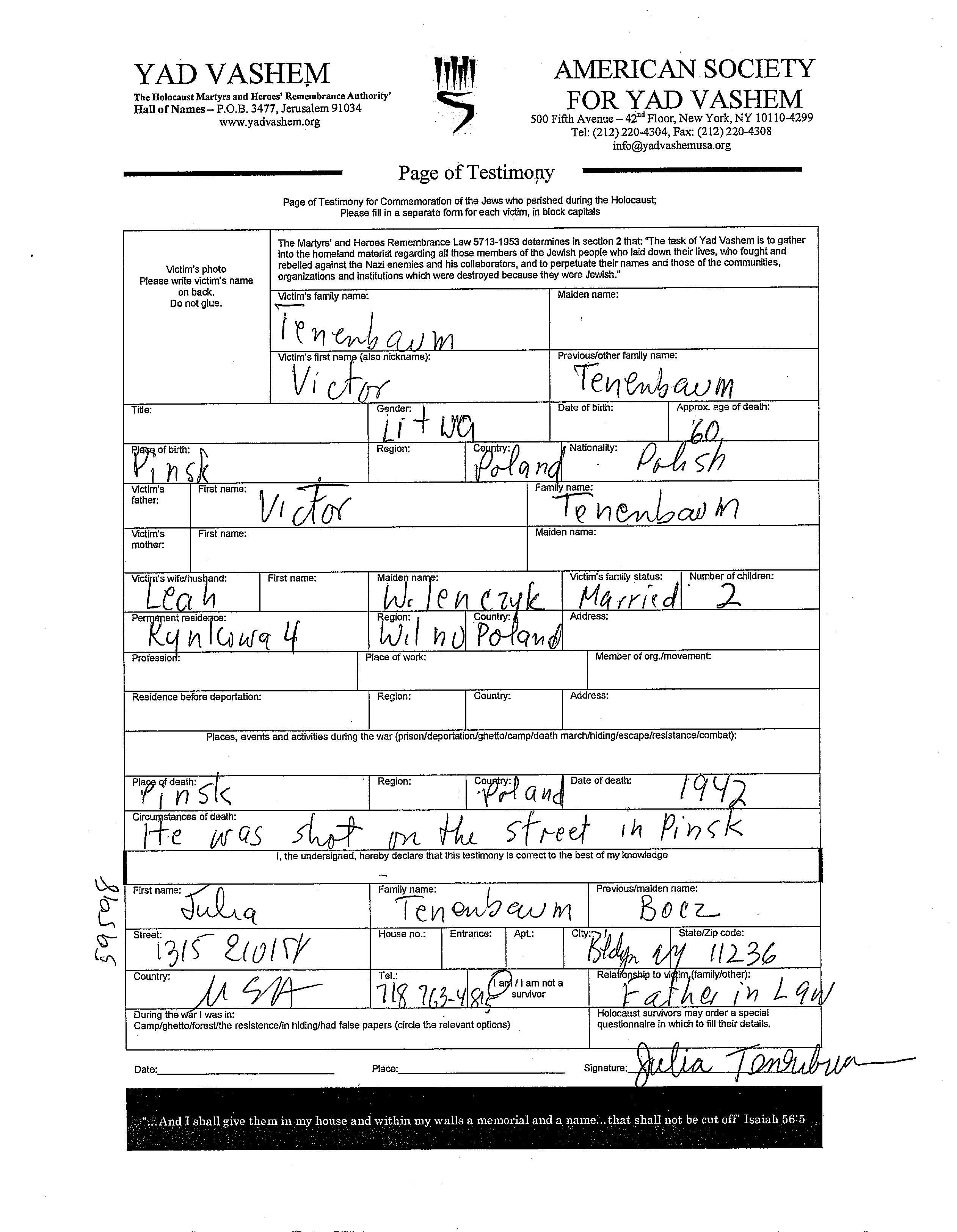 Victor Tenenbaum wurde in Pinsk, Polen geboren. Er war mit Leah, geb. Wilenczyk Verheiratet. Vor dem Zweiten Weltkrieg lebte er in Wilno, Polen.
