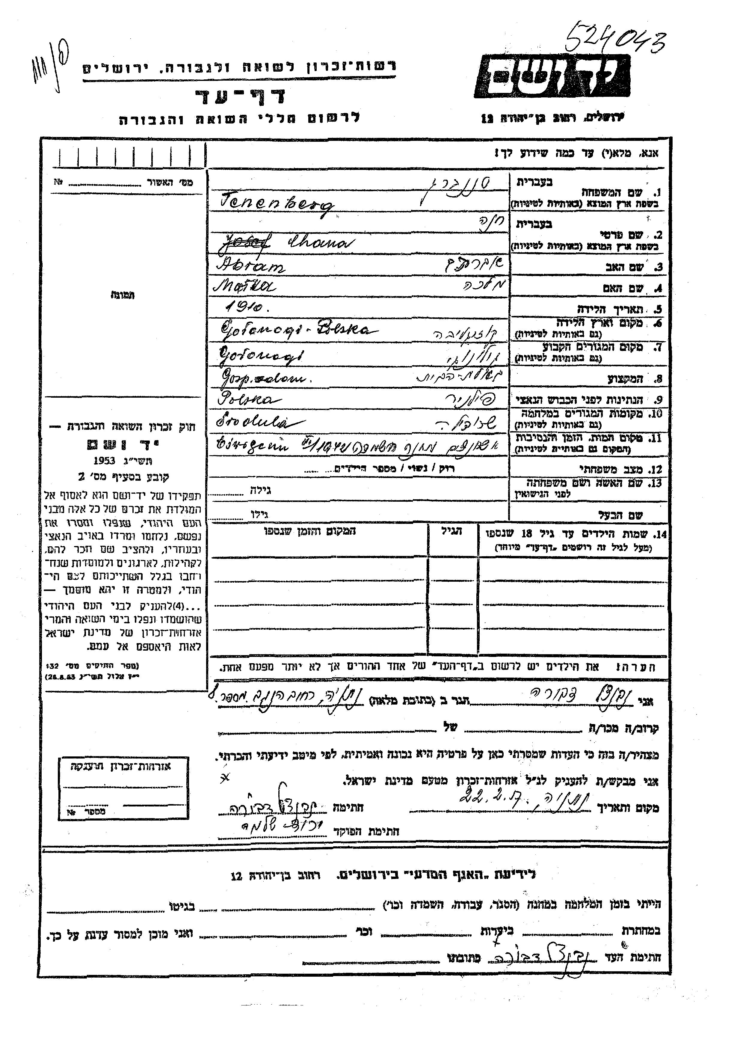 Chana Tenenberg wurde im Jahr 1910 in Beska, Jugoslawien geboren. Sie war die Tochter von Abram und Malka. Sie war Hausfrau. Vor dem Zweiten Weltkrieg lebte sie in Golonog, Polen. Während des Krieges war sie in Srodula, Polen.