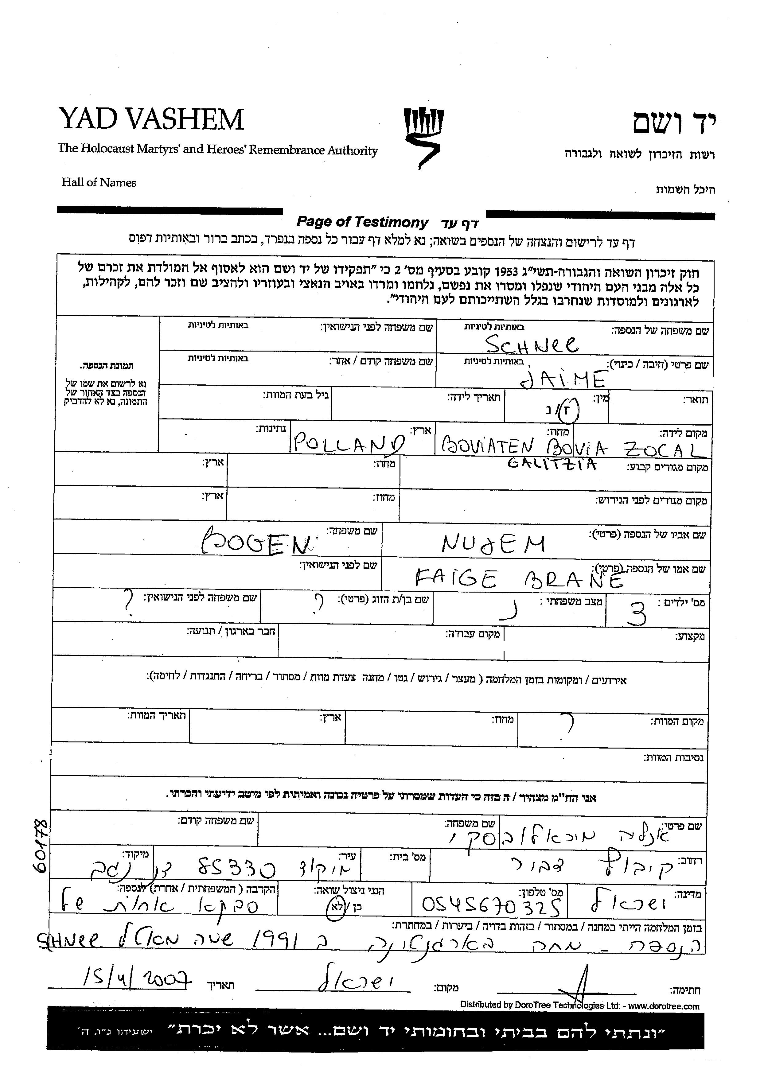 Jaime Schnee wurde in Sokal, Polen geboren. Er war der Sohn von Nujem und Brane Faige, geb. Bogen. Er war Verheiratet.