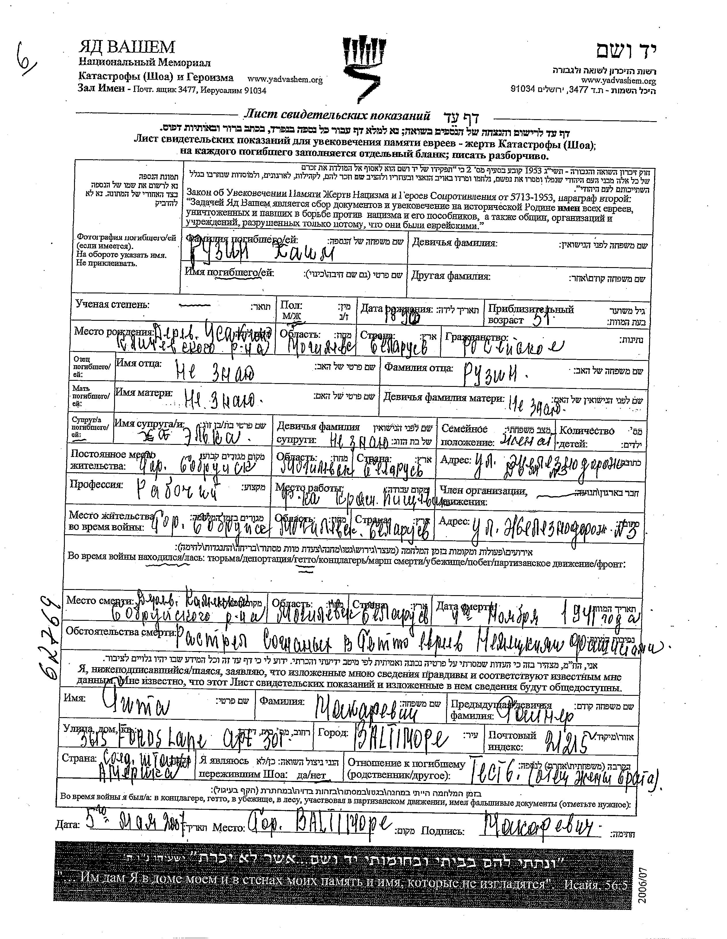 Khaim Ruzin wurde im Jahr 1890 in Usakino, Weißrussland (UdSSR) geboren. Er war Arbeiter/-in und mit Elka Verheiratet. Vor dem Zweiten Weltkrieg lebte er in Bobruysk, Weißrussland (UdSSR). Während des Krieges war er in Bobruysk, Weißrussland (UdSSR).