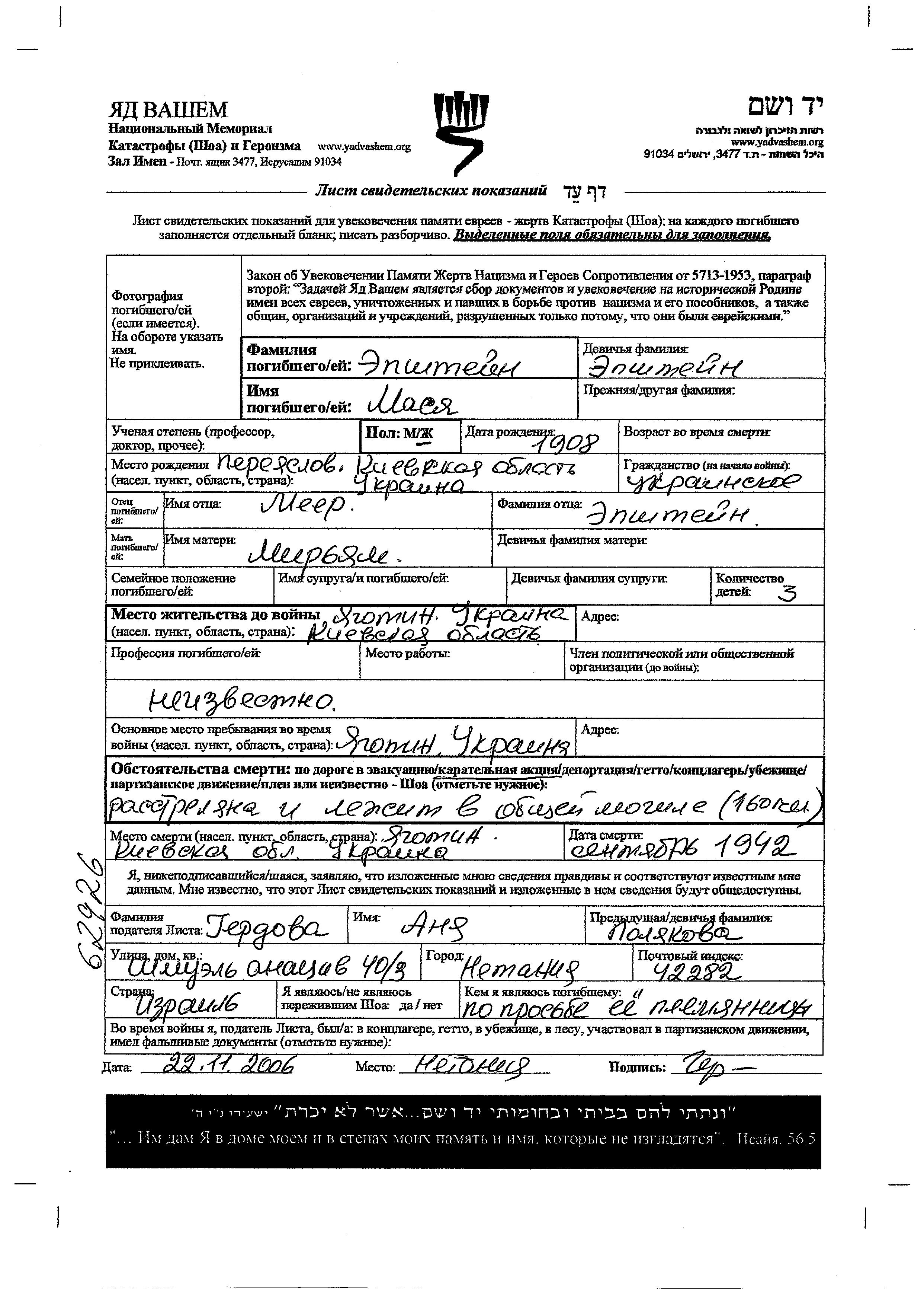 Mosya wurde in der Schoah ermordet. Todesort: Yagotin, Ukraine (UdSSR) im Jahr 09/1942.