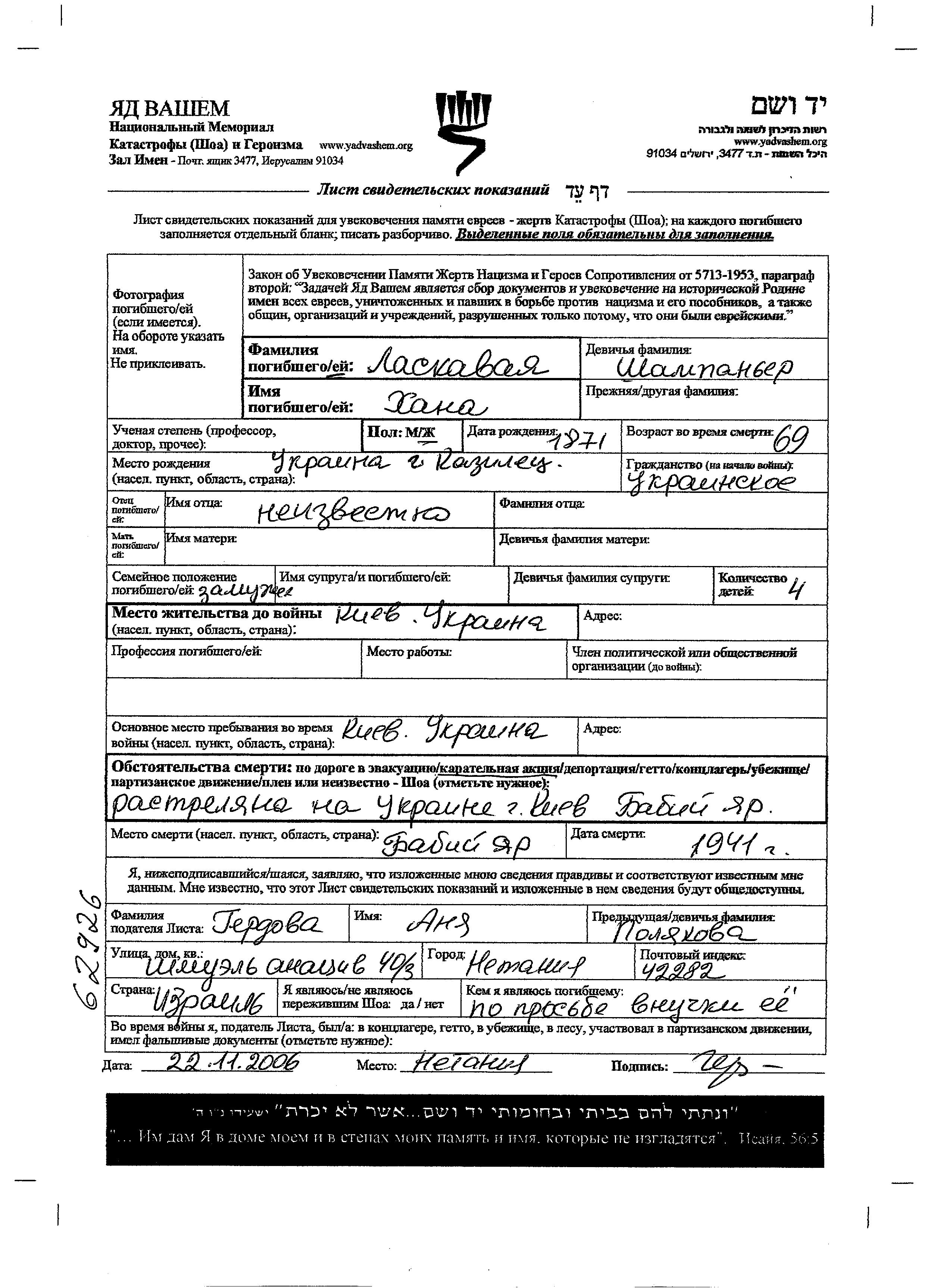 Khana Laskavaya, geb. Shampanyer wurde im Jahr 1871 in Kozelets, Ukraine (UdSSR) geboren. Sie war Verheiratet. Vor dem Zweiten Weltkrieg lebte sie in Kiev, Ukraine (UdSSR). Während des Krieges war sie in Kiev, Ukraine (UdSSR).