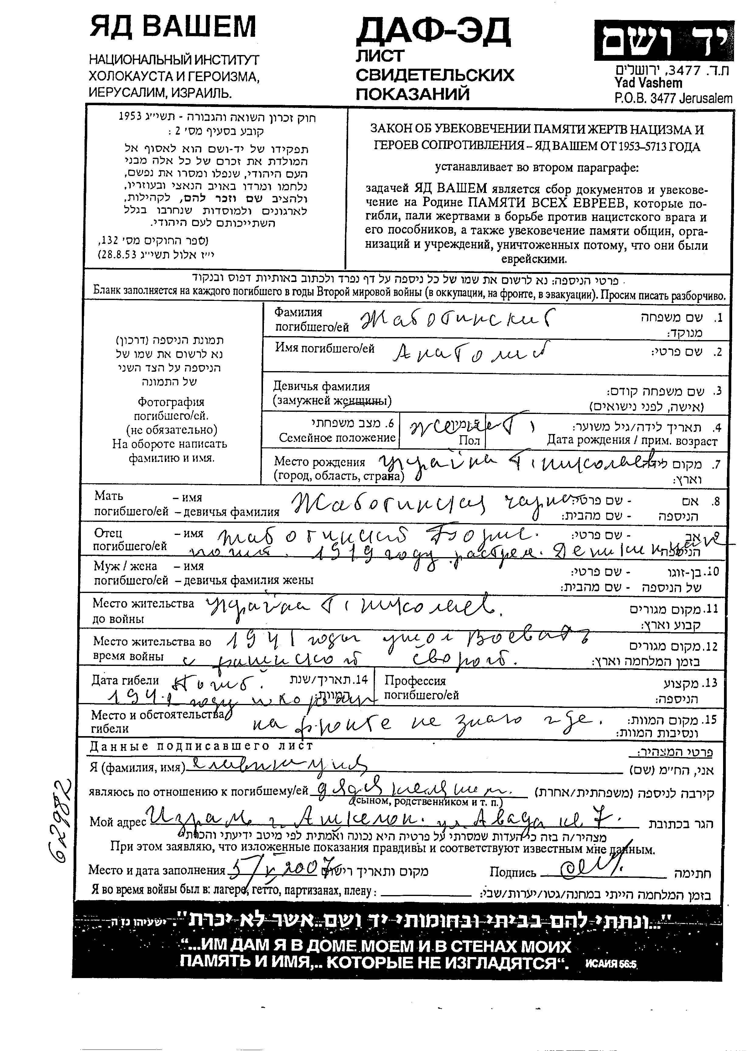 Zhabotinski Anatoli Nikolayev, Ukraine (UdSSR) Gedenkblatt