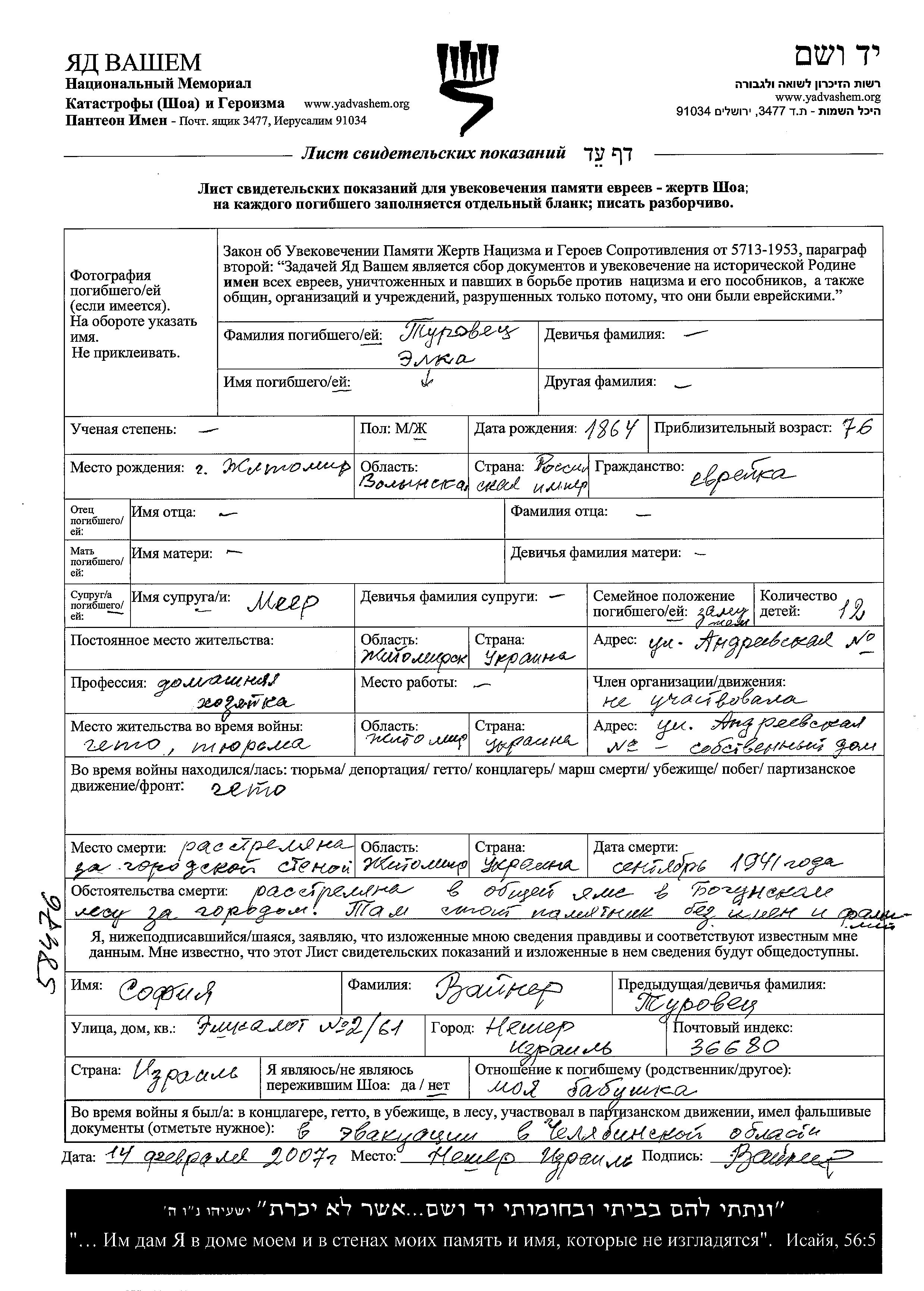 Elka Turovetz wurde im Jahr 1864 in Zhitomir, Ukraine (UdSSR) geboren. Sie war Hausfrau und mit Meyer Verheiratet. Vor dem Zweiten Weltkrieg lebte sie in Zhitomir, Ukraine (UdSSR). Während des Krieges war sie in Zhitomir, Ukraine (UdSSR).