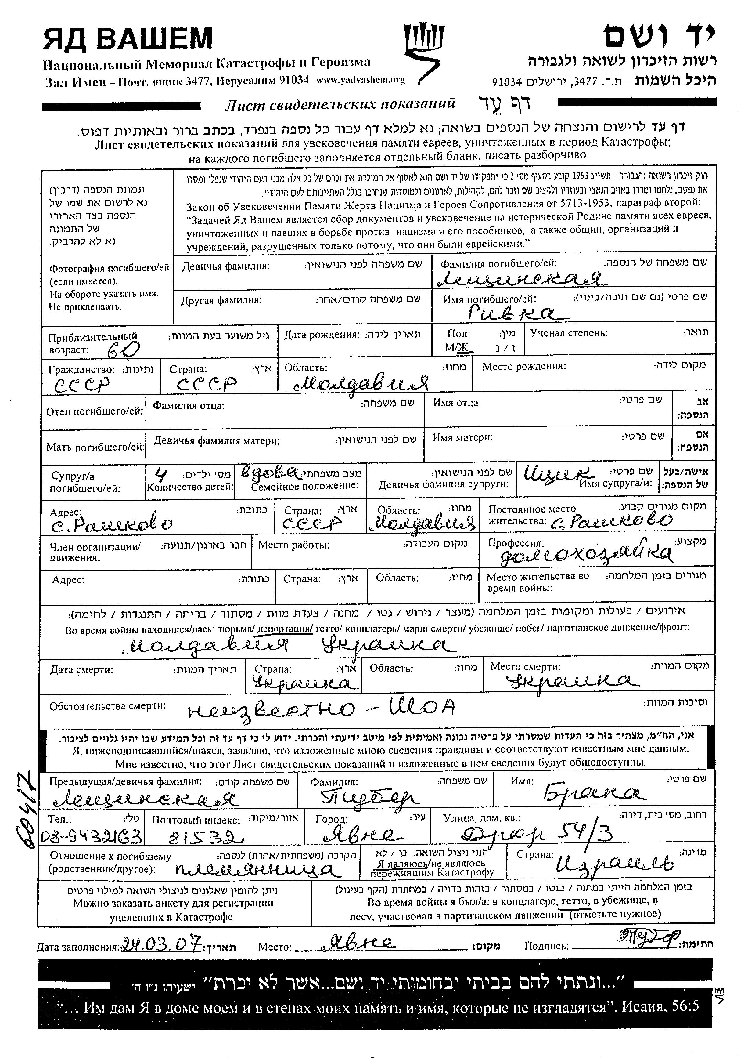 Rivka wurde in der Schoah ermordet. Todesort: Ukraine (UdSSR).