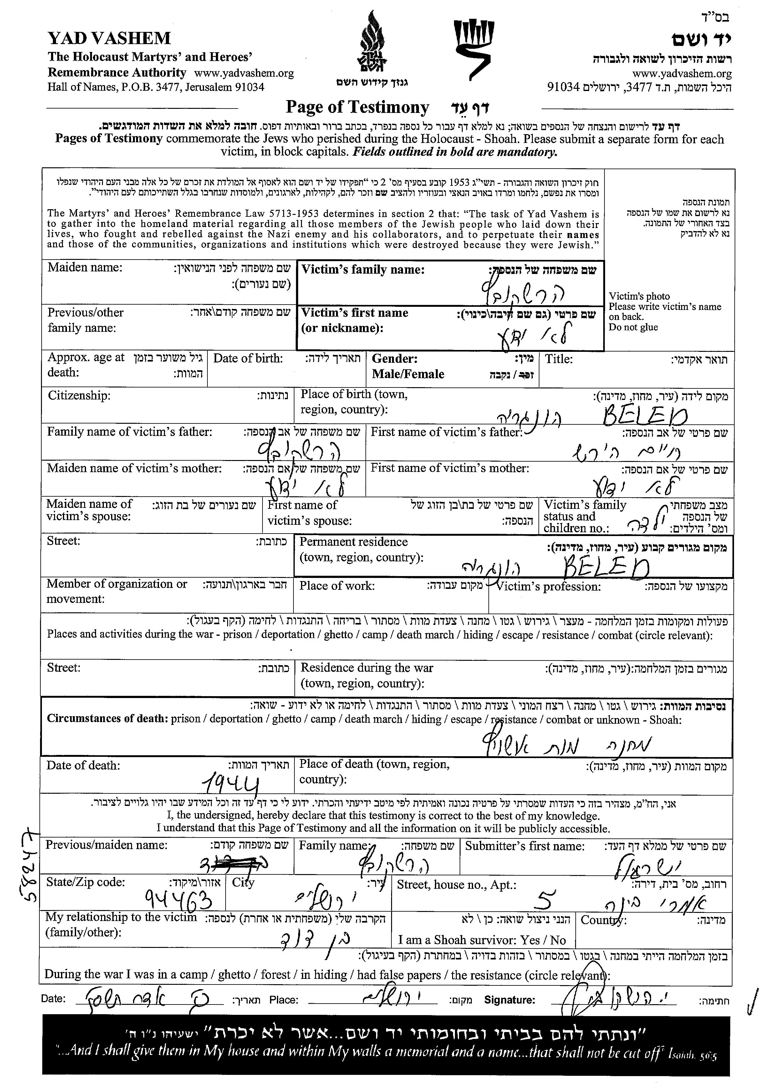 Hershkovitz Vorname unbekannt Beled, Ungarn Gedenkblatt