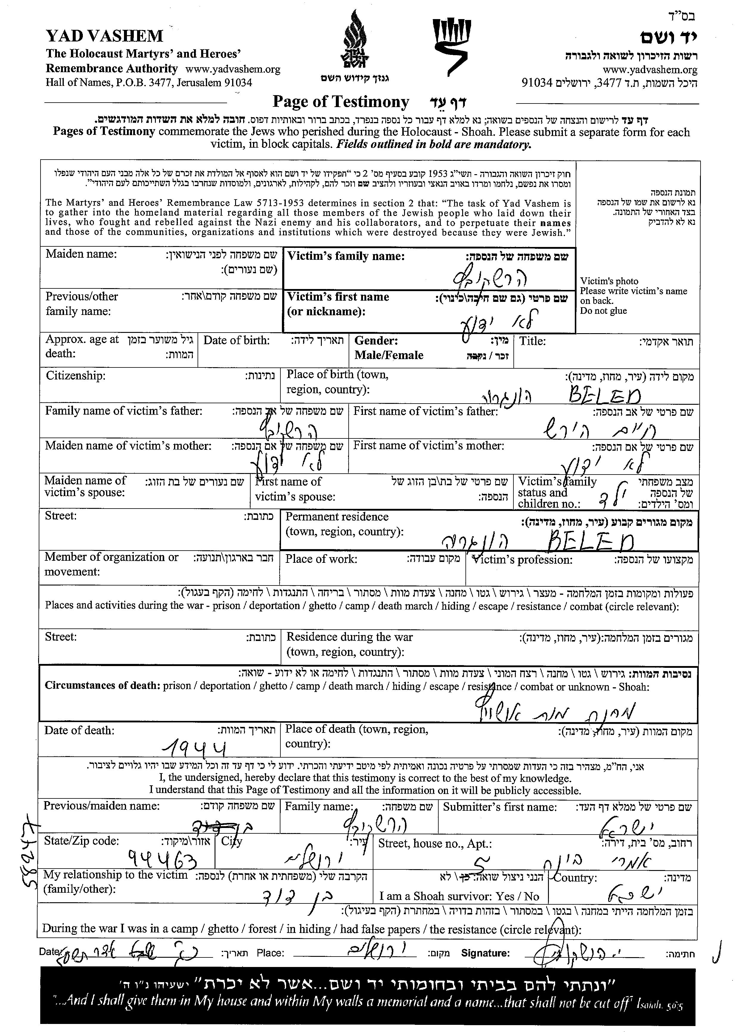 Hershkovitz Vorname unbekannt Beled, Ungarn Gedenkblatt
