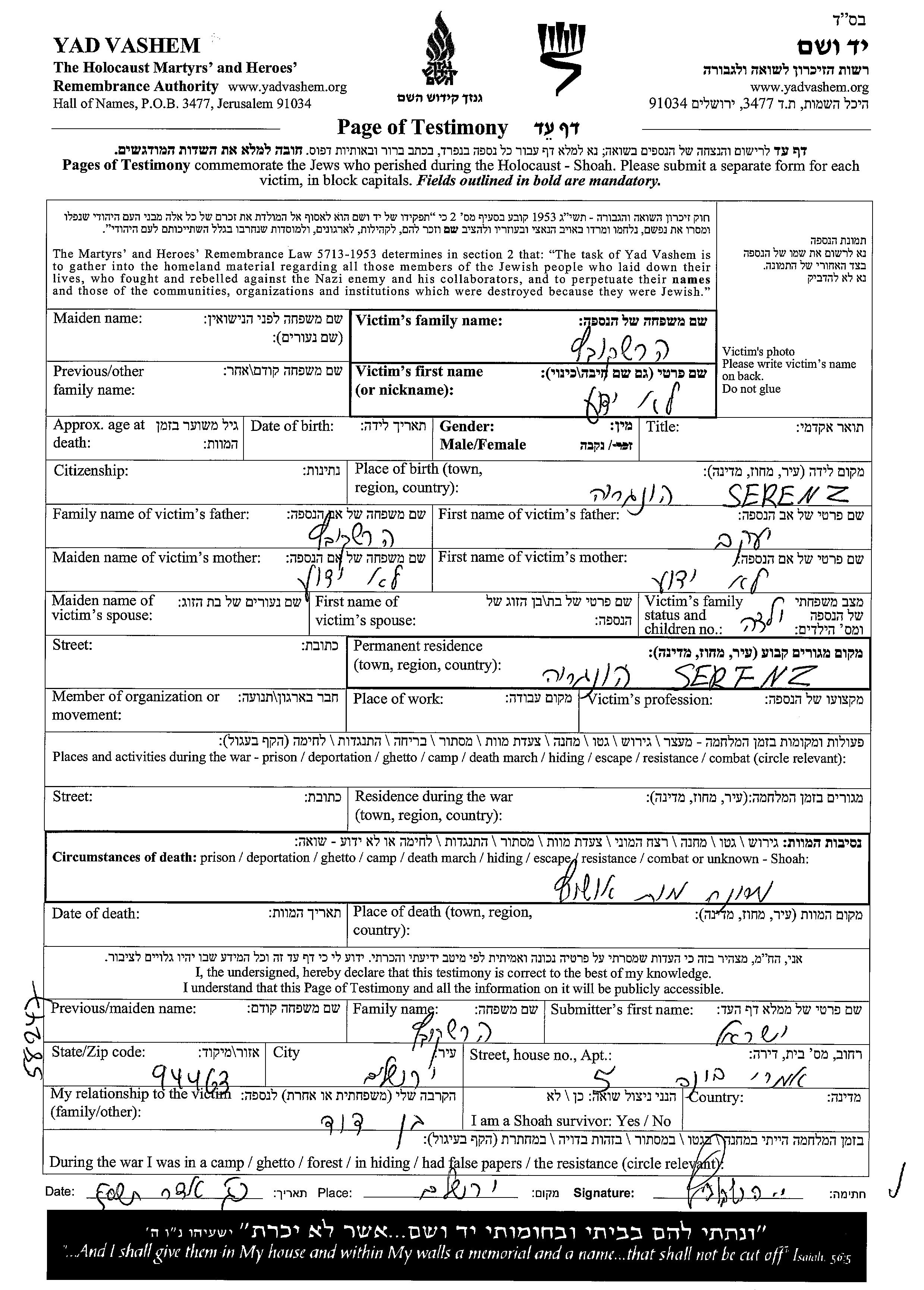 Hershkovitz Vorname unbekannt Serenc, Ungarn Gedenkblatt
