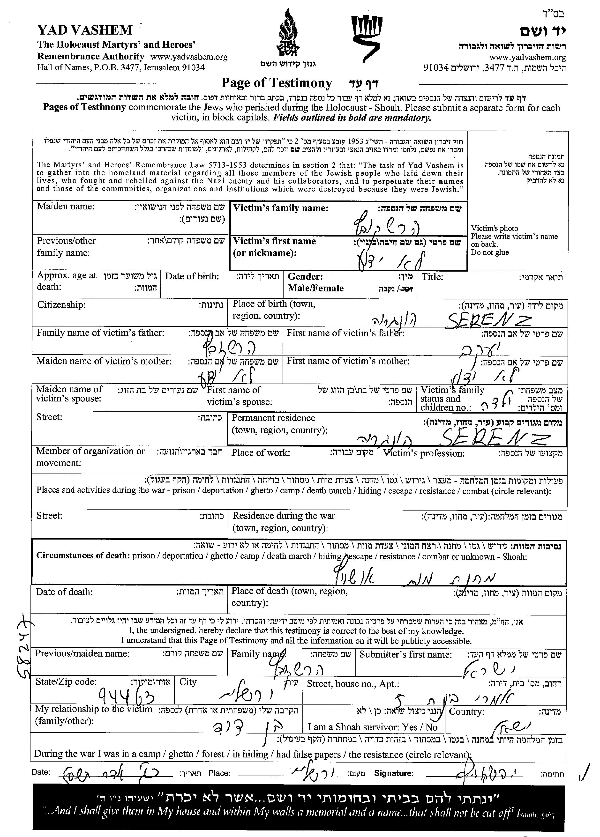Hershkovitz Vorname unbekannt Serenc, Tschechoslowakei Gedenkblatt