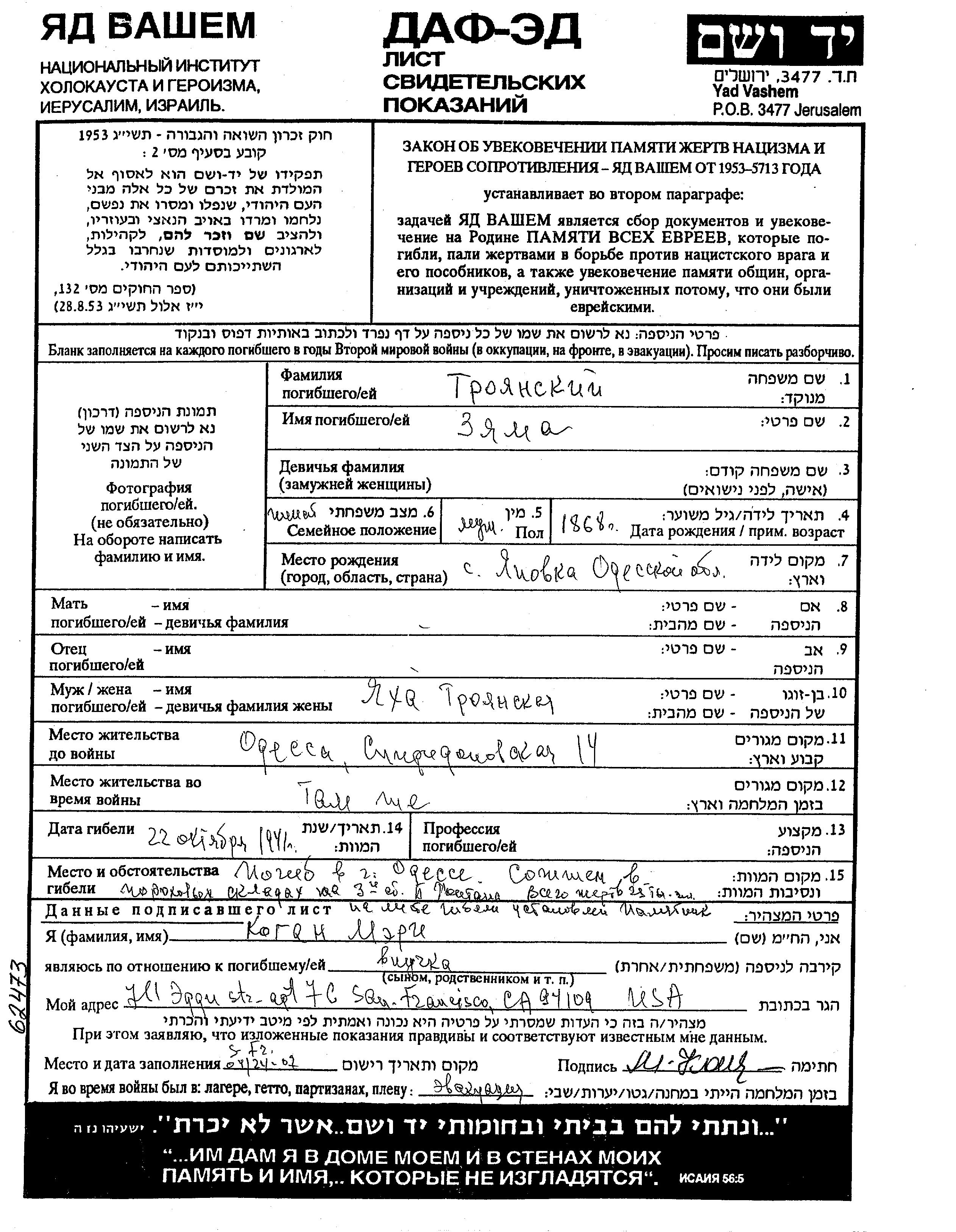 Zyama Troyanski wurde im Jahr 1868 in Yanovka, Ukraine (UdSSR) geboren. Er war mit Yakha Verheiratet. Vor dem Zweiten Weltkrieg lebte er in Odessa, Ukraine (UdSSR). Während des Krieges war er in Odessa, Ukraine (UdSSR).