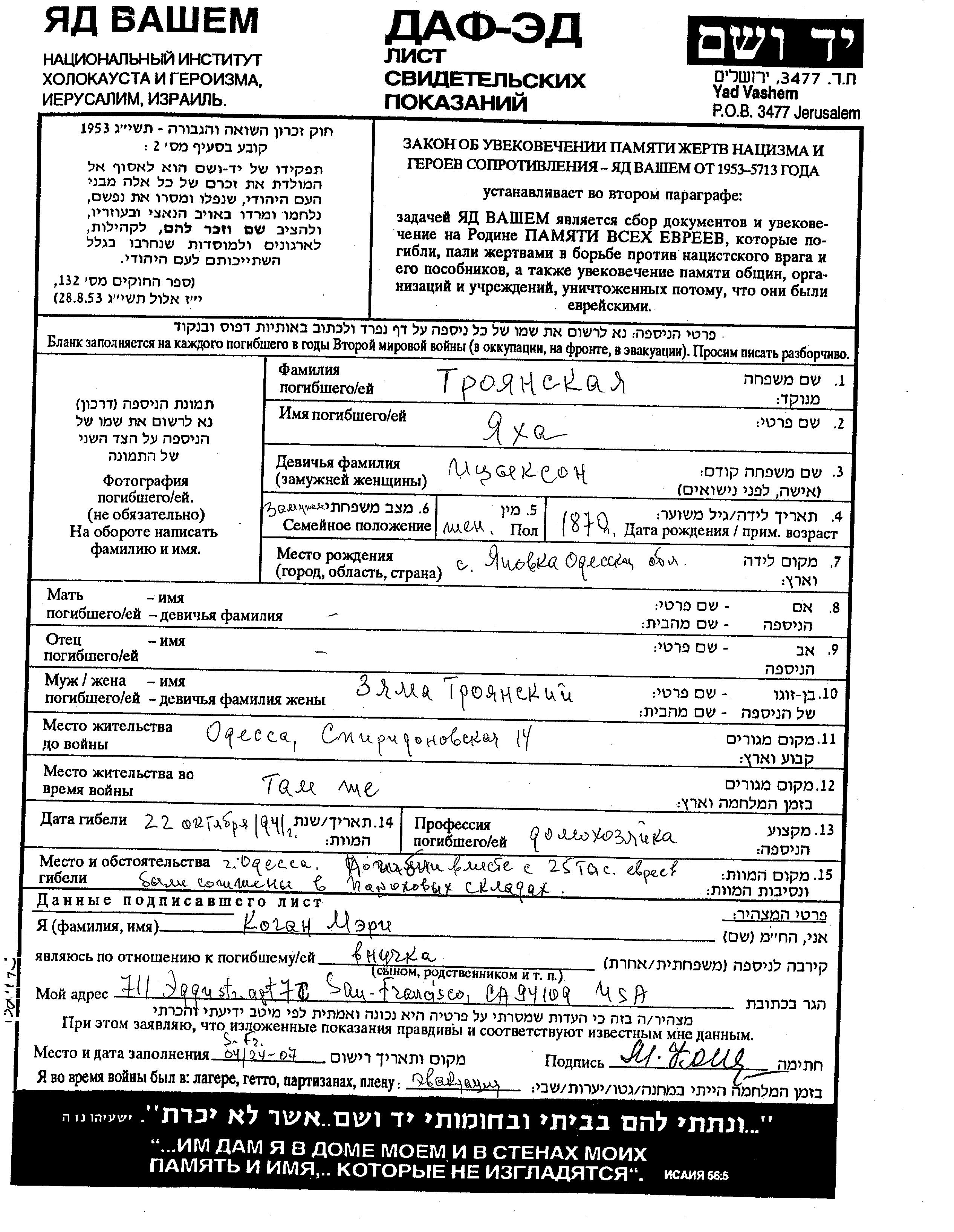 Yakha Troyanskaya, geb. Itzykson wurde im Jahr 1870 in Yanovka, Ukraine (UdSSR) geboren. Sie war Hausfrau und mit Zyma Verheiratet. Vor dem Zweiten Weltkrieg lebte sie in Odessa, Ukraine (UdSSR). Während des Krieges war sie in Odessa, Ukraine (UdSSR).