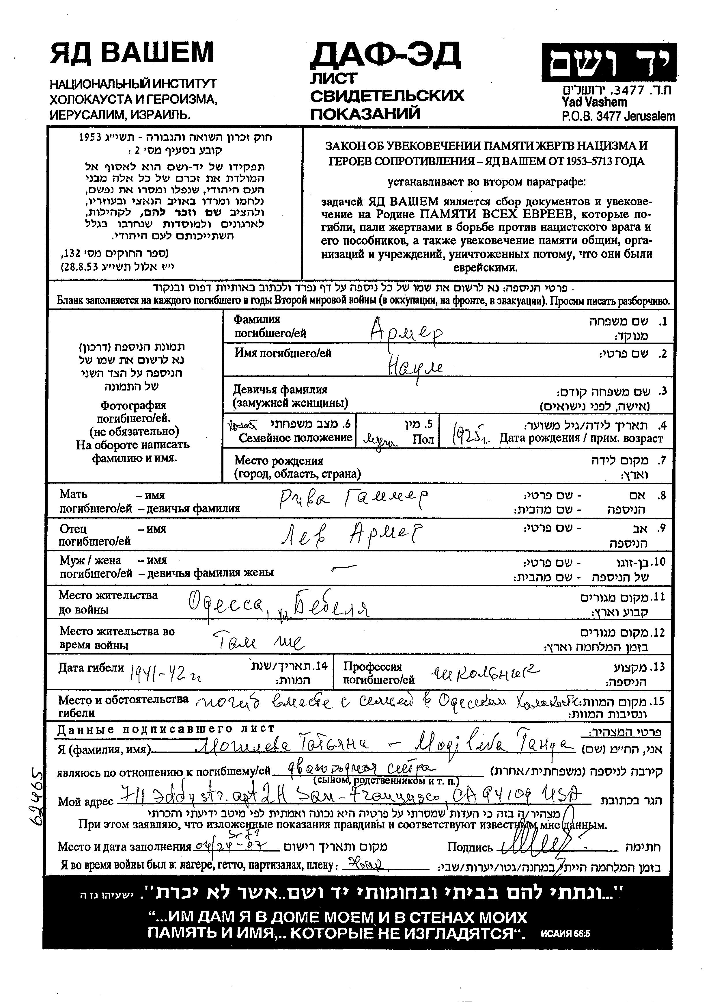 Naum Armer wurde im Jahr 1925 geboren. Er war der Sohn von Lev und Riva, geb. Gammer. Er war Schuljunge und Jugendliche/-r. Vor dem Zweiten Weltkrieg lebte er in Odessa, Ukraine (UdSSR). Während des Krieges war er in Odessa, Ukraine (UdSSR).