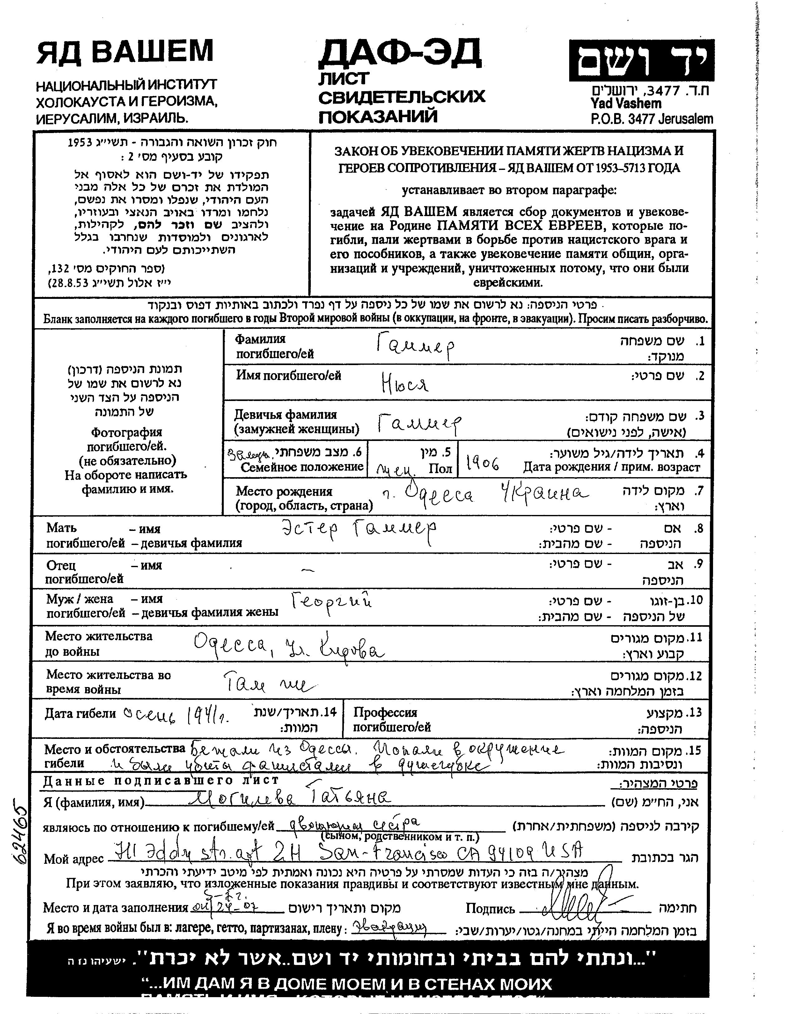 Nyusya Gammer, geb. Gammer wurde im Jahr 1906 in Odessa, Ukraine (UdSSR) geboren. Sie war die Tochter von Ester. Sie war mit Georgi Verheiratet. Vor dem Zweiten Weltkrieg lebte sie in Odessa, Ukraine (UdSSR). Während des Krieges war sie in Odessa, Ukraine (UdSSR).