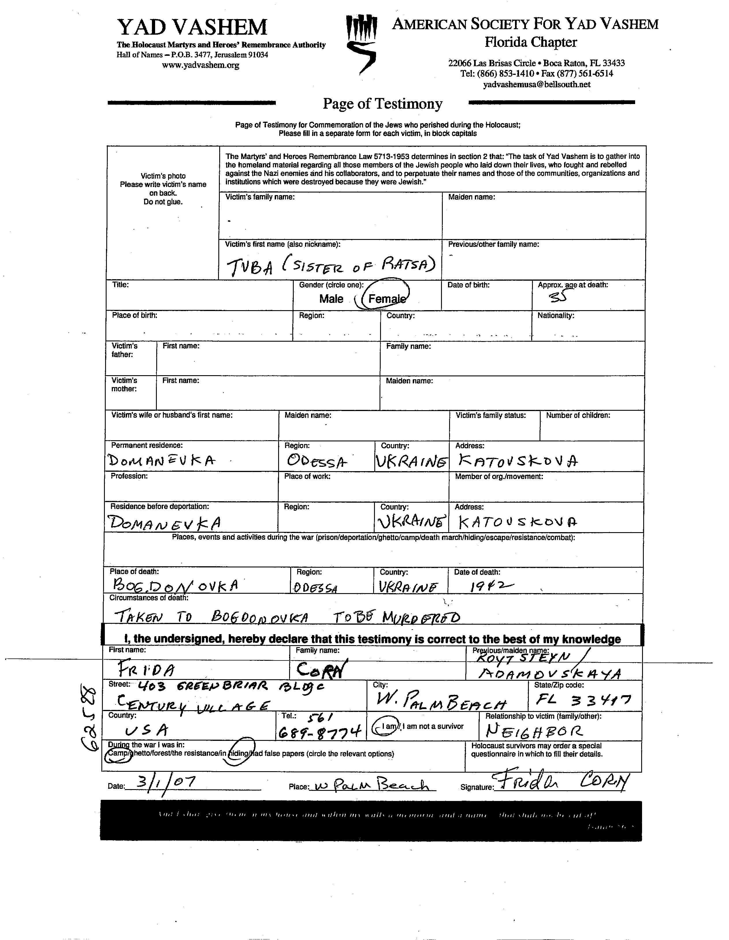 Tuba wurde in der Schoah ermordet. Todesort: Bogdanovka, Ukraine (UdSSR) im Jahr 1942.