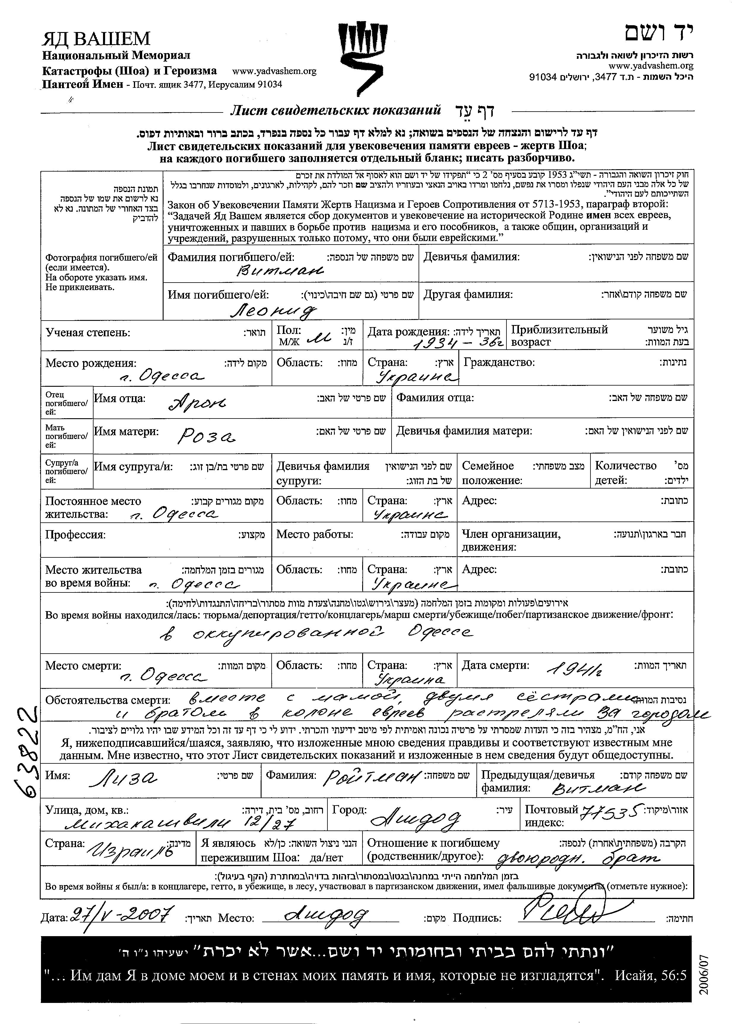 Leonid wurde in der Schoah ermordet. Todesort: Odessa, Ukraine (UdSSR) im Jahr 1941.