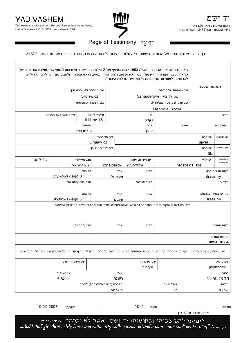 Hennola Frogel Sznajderowicz, geb. Orgiewicz wurde im Jahr 1911 in Polen geboren. Sie war die Tochter von Fajwel und Itta. Sie war mit Fiszel Moszek Verheiratet. Vor dem Zweiten Weltkrieg lebte sie in Brzeziny, Polen. Während des Krieges war sie in Brzeziny, Polen.