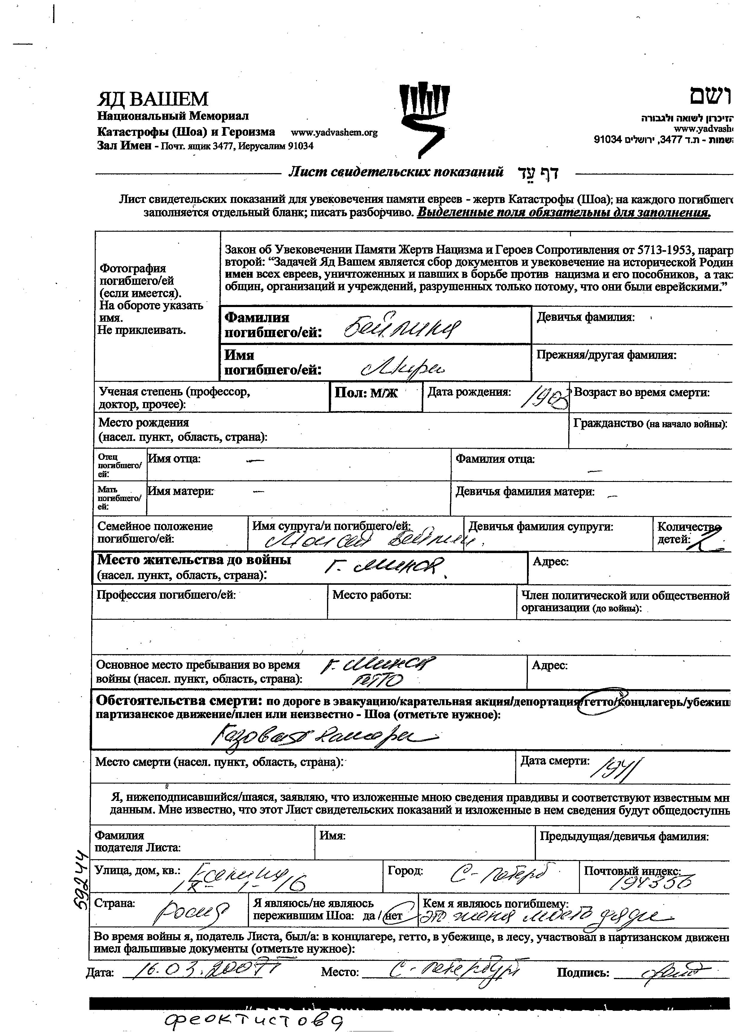 Mira Beilina wurde im Jahr 1903 geboren. Sie war mit Moisei Verheiratet. Vor dem Zweiten Weltkrieg lebte sie in Minsk, Weißrussland (UdSSR). Während des Krieges war sie in Minsk, Weißrussland (UdSSR).