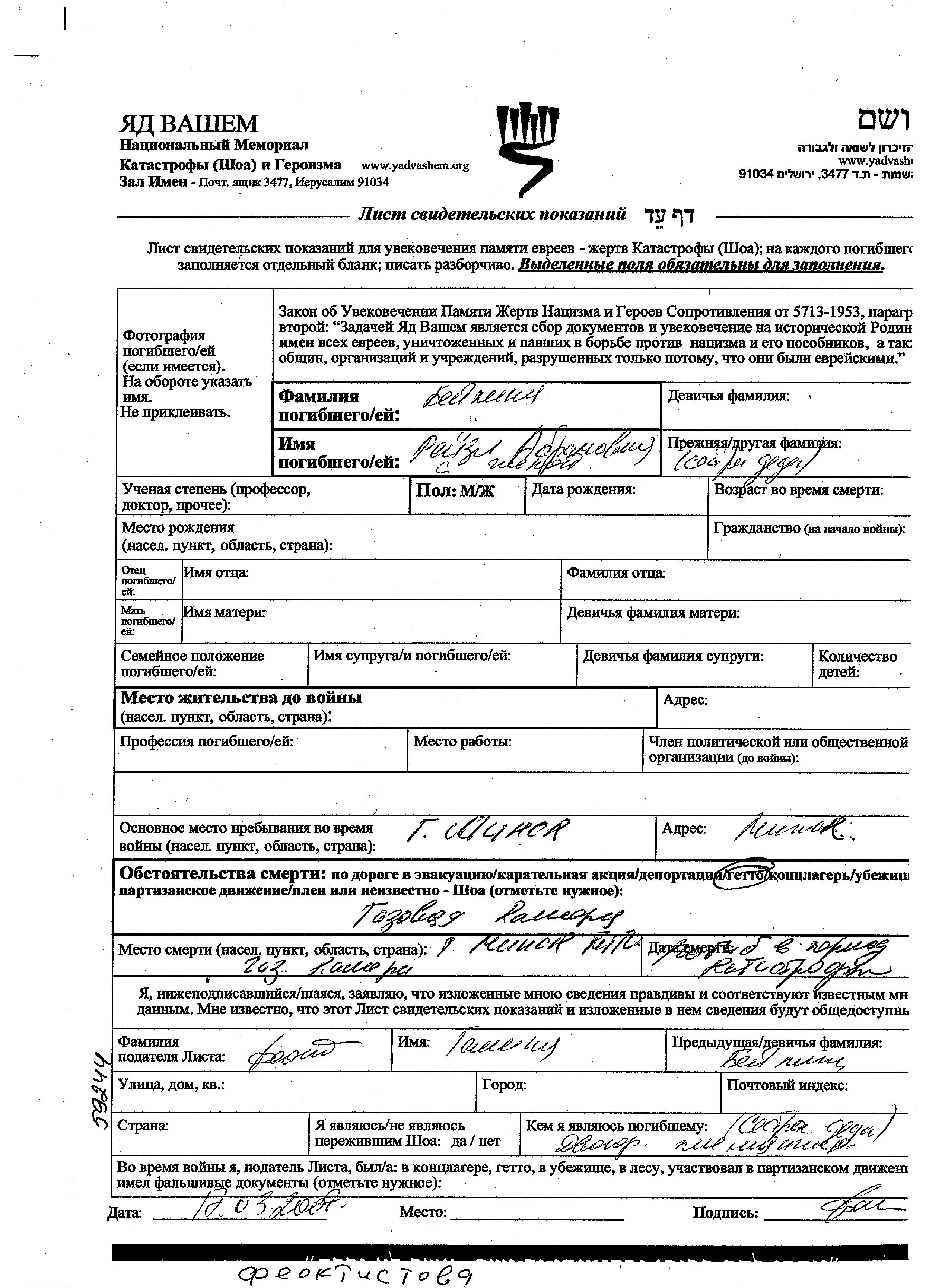 Reizl Beilina wurde Sie war die Tochter von Abram. Sie war Verheiratet. Vor dem Zweiten Weltkrieg lebte sie in Minsk, Weißrussland (UdSSR). Während des Krieges war sie in Minsk, Weißrussland (UdSSR).