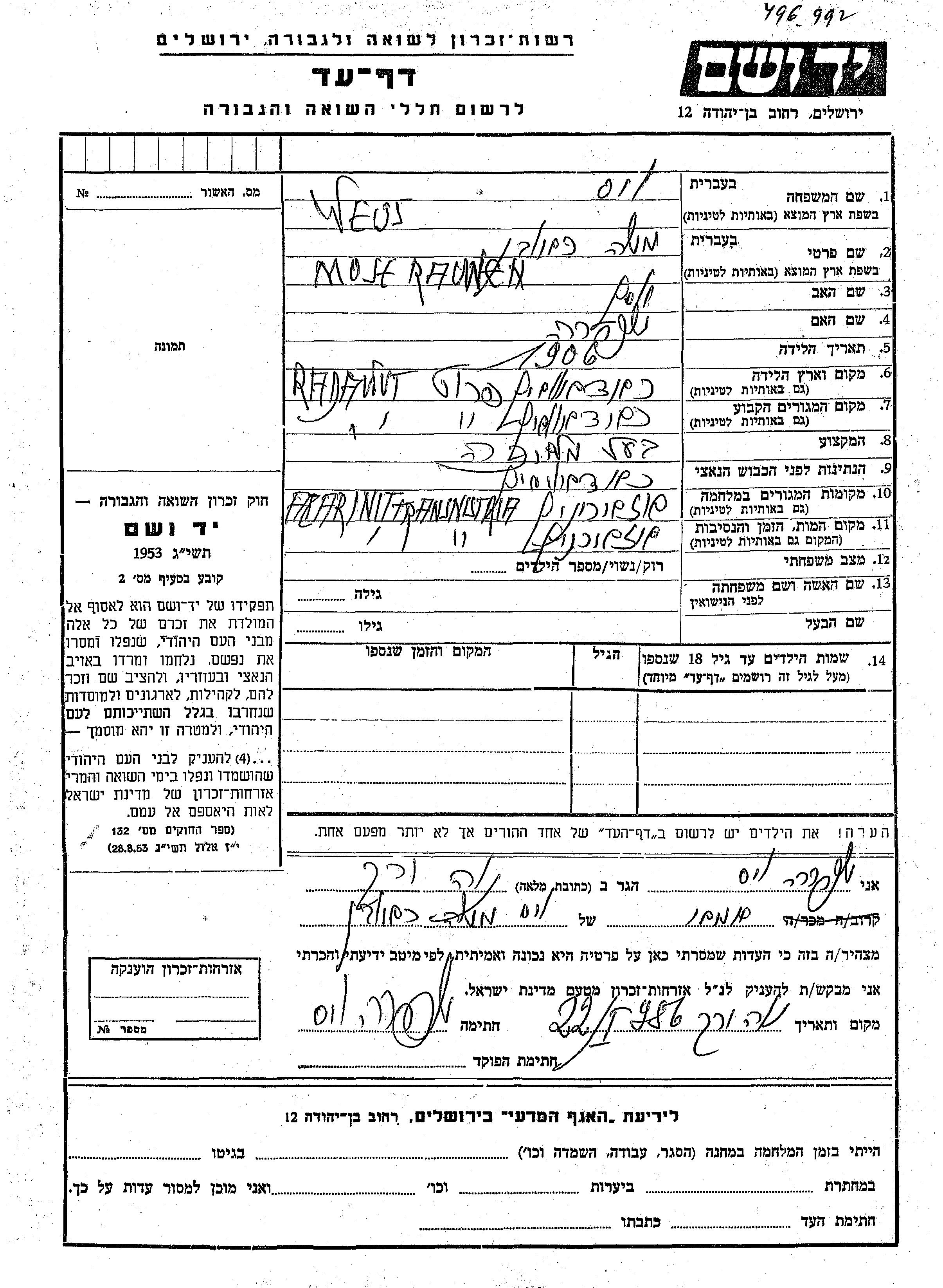 Mose Rauwen Weis wurde im Jahr 1906 geboren. Er war der Sohn von Yosef und Shifra. Er war Handwerker. Während des Krieges war er in Transnistria, Ukraine (UdSSR).