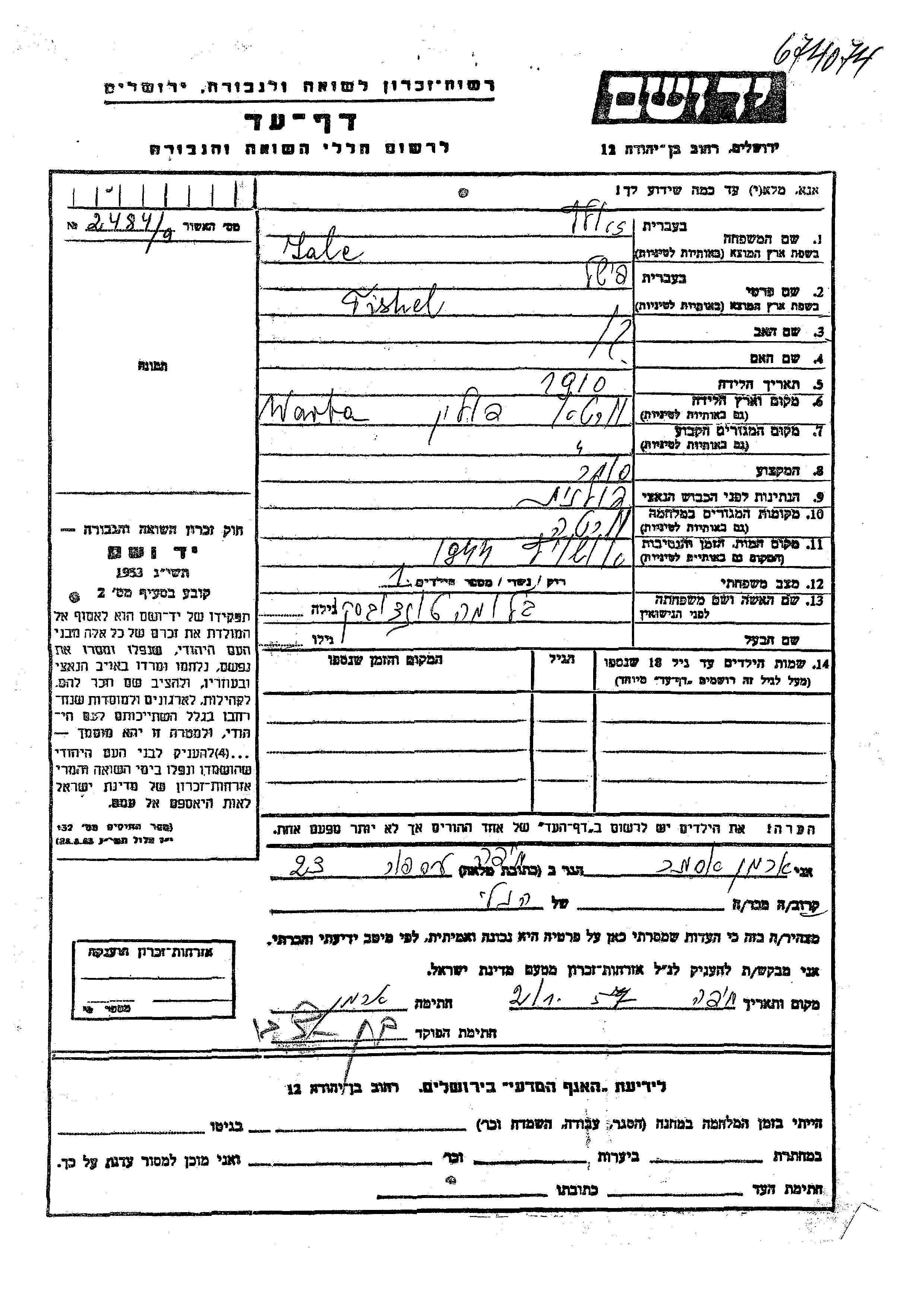 Fishel Zalc wurde im Jahr 1910 in Warta, Polen geboren. Er war Kaufmann/-frau und mit Bluma, geb. Tundovski Verheiratet. Vor dem Zweiten Weltkrieg lebte er in Warta, Polen. Während des Krieges war er in Warta, Polen.