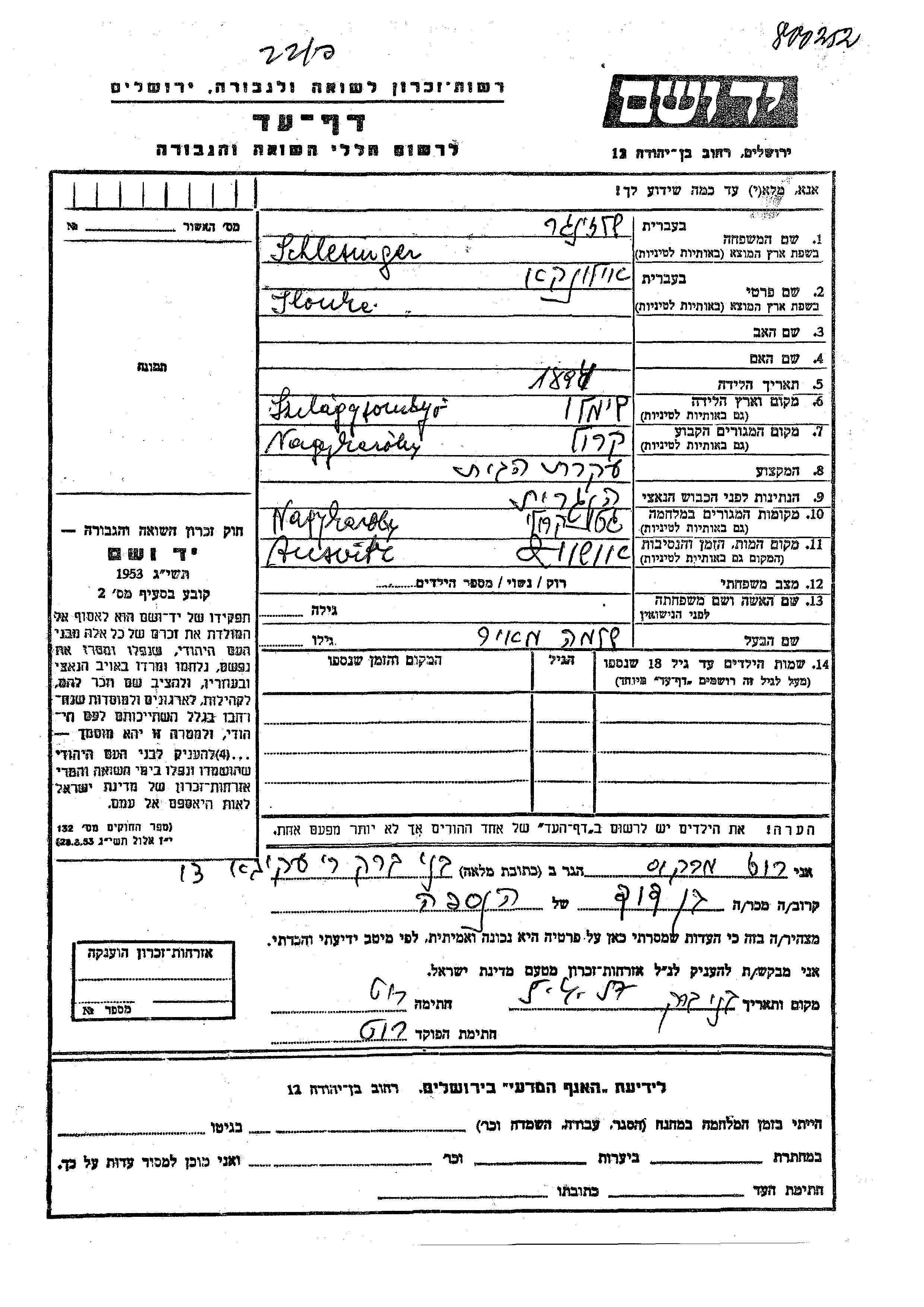 Jlonke Schlesinger wurde im Jahr 1894 in Szilagy Somlyo, Rumänien geboren. Sie war Hausfrau. Vor dem Zweiten Weltkrieg lebte sie in Nagy Karoly, Rumänien. Während des Krieges war sie in Nagy Karoly, Rumänien.