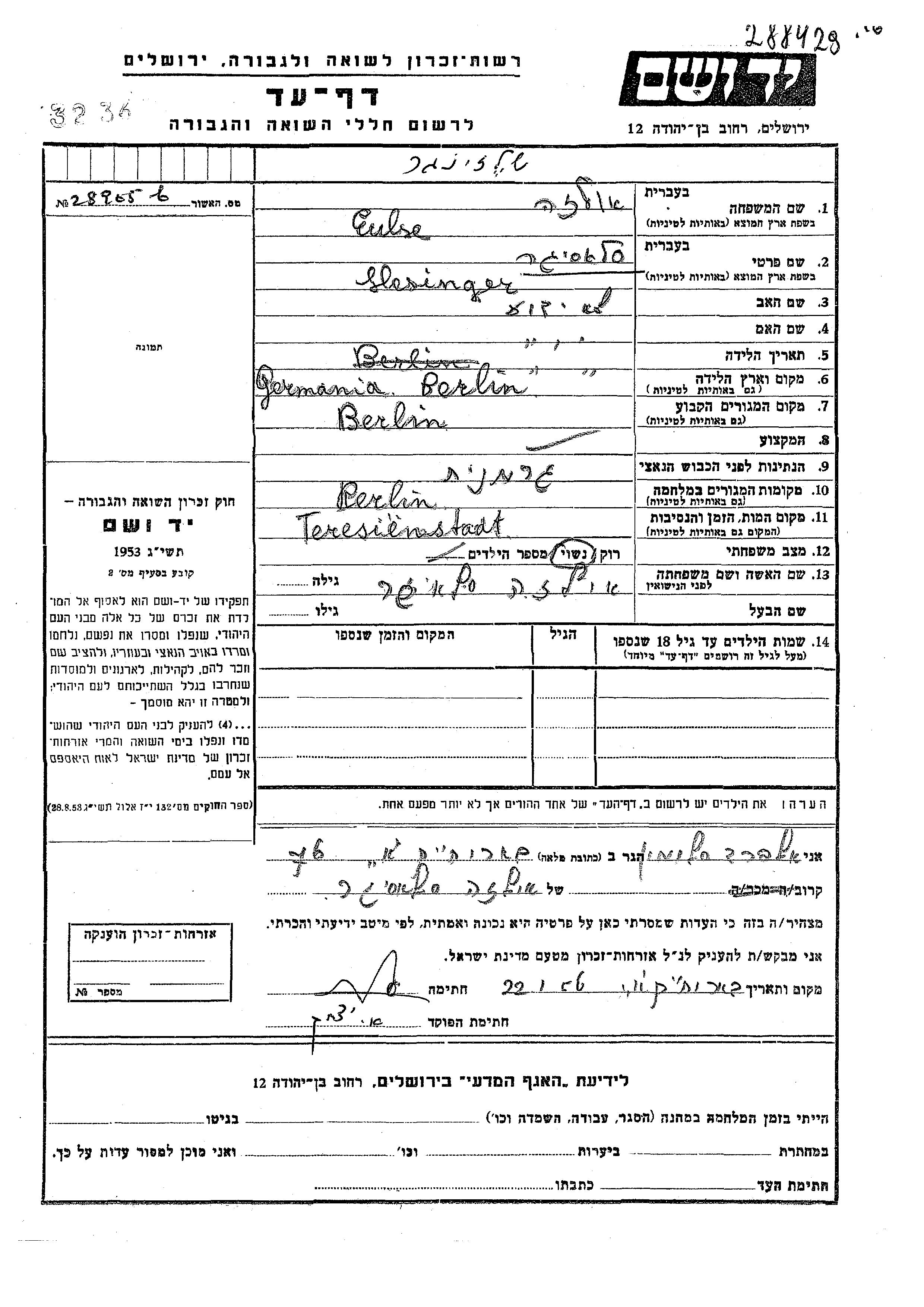 Eulse Slesinger, geb. Slaser wurde in Berlin, Deutsches Reich geboren. Sie war Verheiratet. Vor dem Zweiten Weltkrieg lebte sie in Berlin, Deutsches Reich. Während des Krieges war sie in Berlin, Deutsches Reich.