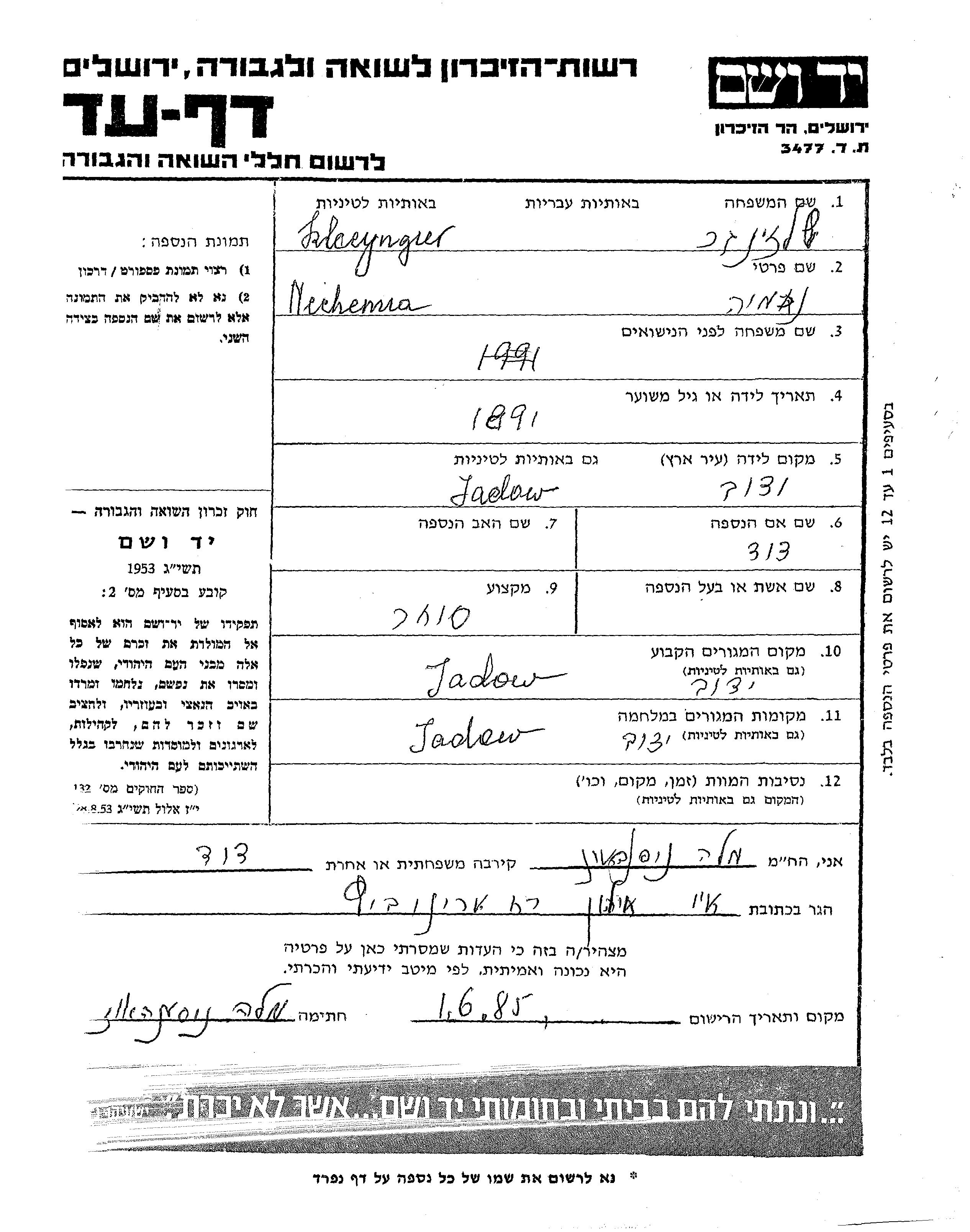 Nechemia Szlecyngier wurde im Jahr 1891 in Jadow, Polen geboren. Er war der Sohn von David. Er war Kaufmann/-frau. Vor dem Zweiten Weltkrieg lebte er in Jadow, Polen. Während des Krieges war er in Jadow, Polen.