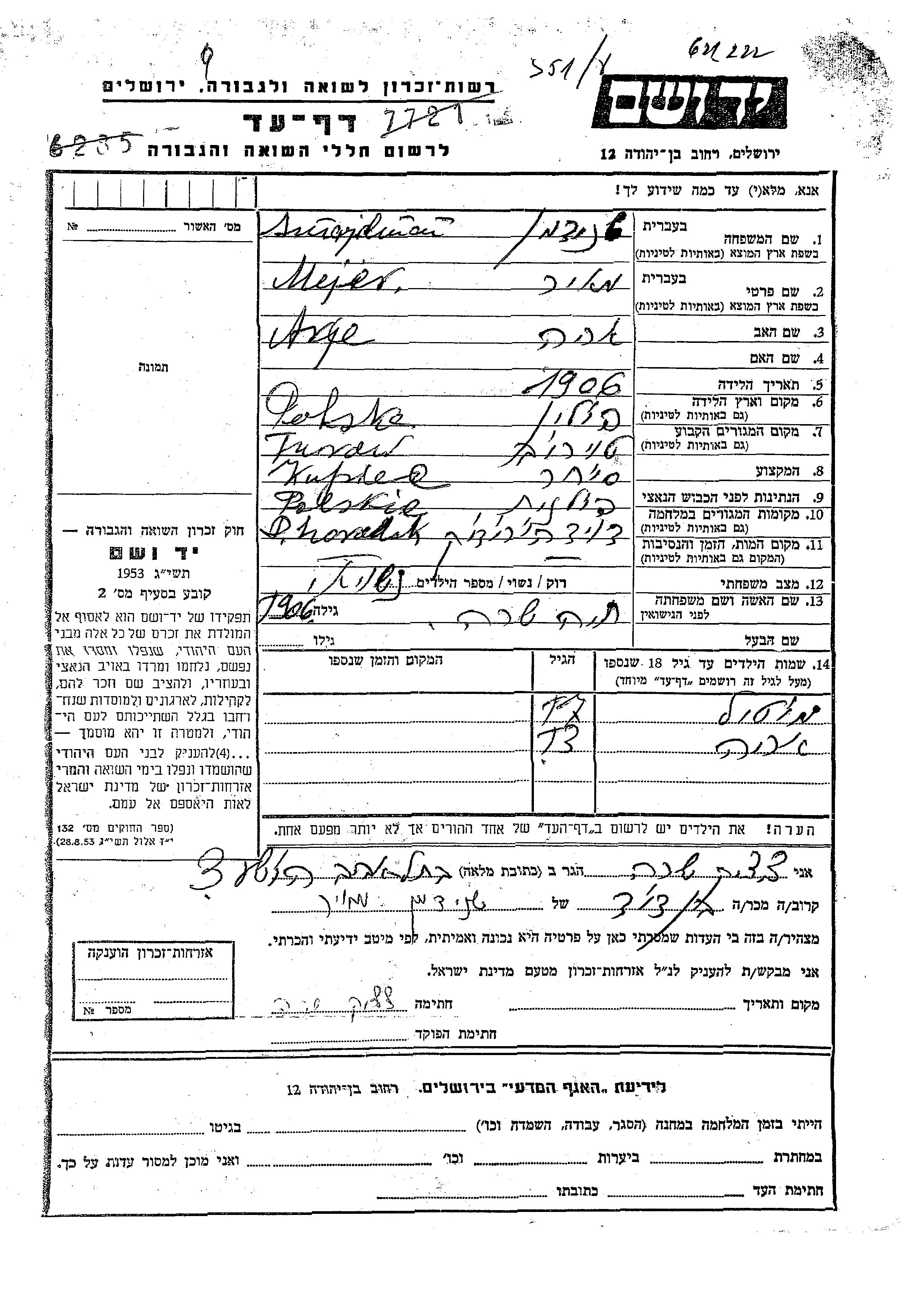 Mejer Sznajdman Shnitman wurde im Jahr 1906 in Polen geboren. Er war der Sohn von Arje. Er war Kaufmann/-frau und mit Khaia Sara Verheiratet. Vor dem Zweiten Weltkrieg lebte er in Turow, Polen. Während des Krieges war er in Dawidgrodek, Polen.