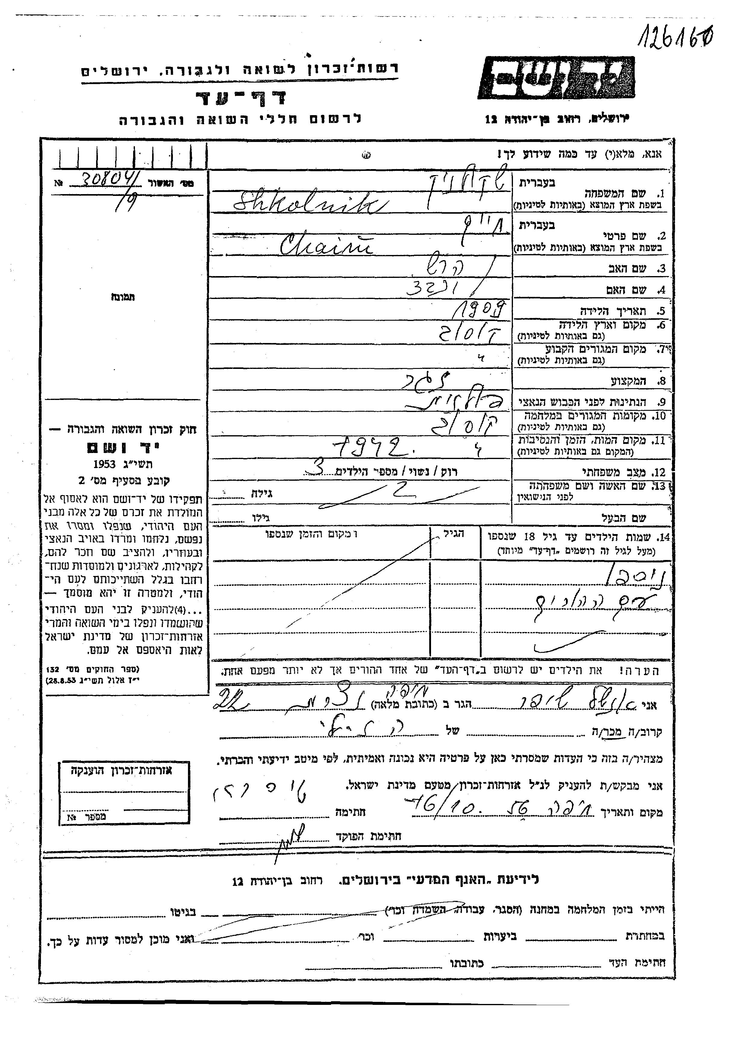 Chaim Shkolnik wurde im Jahr 1909 in Kosow, Polen geboren. Er war der Sohn von Hersh und Yokheved. Er war Zimmermann und Verheiratet. Vor dem Zweiten Weltkrieg lebte er in Kosow, Polen. Während des Krieges war er in Kosow, Polen.