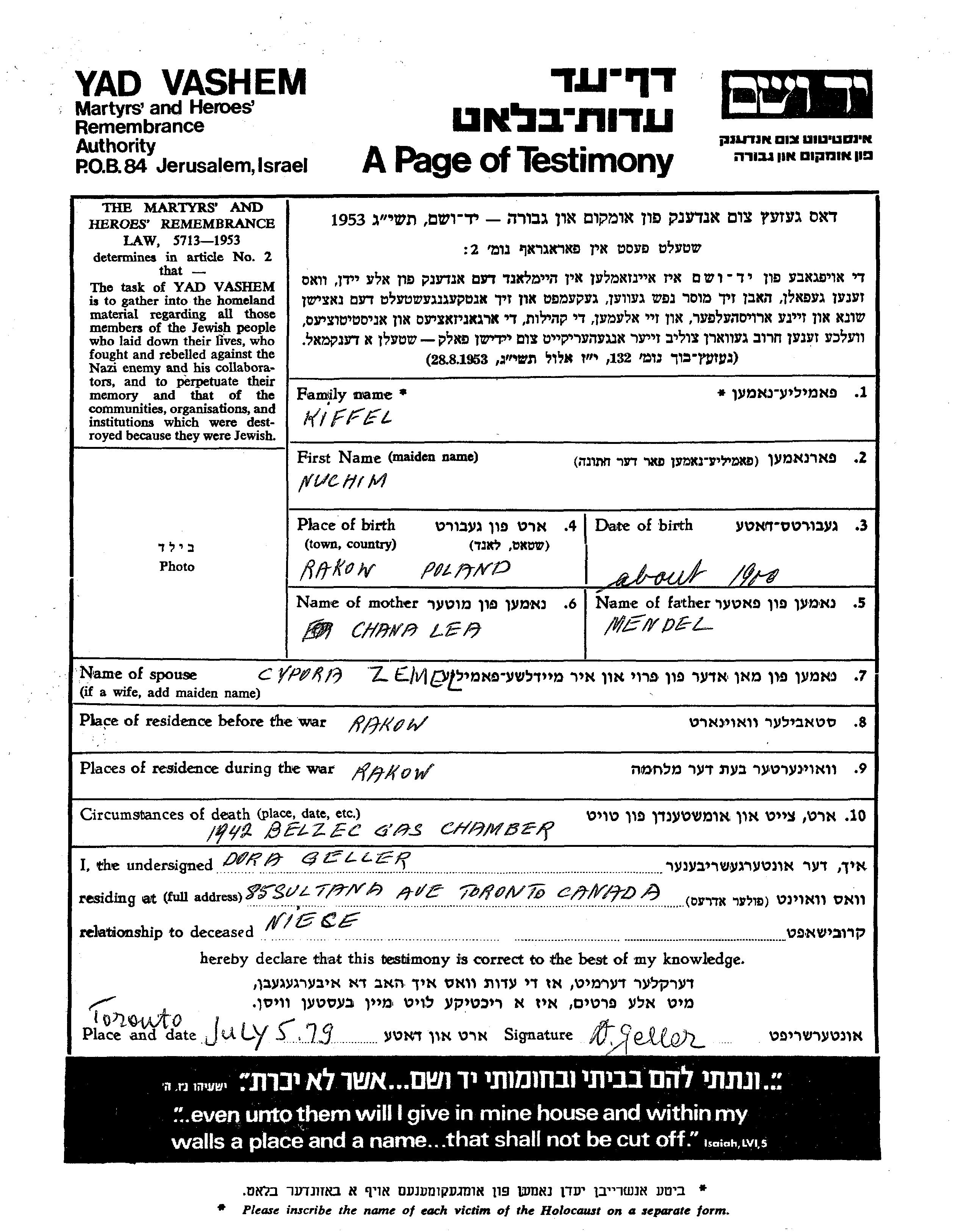 Nuchim Kiffel wurde im Jahr 1910 in Rakow, Polen geboren. Er war der Sohn von Mendel und Chana Lea. Er war mit Cypora, geb. Zemel Verheiratet. Vor dem Zweiten Weltkrieg lebte er in Rakow, Polen. Während des Krieges war er in Rakow, Polen.