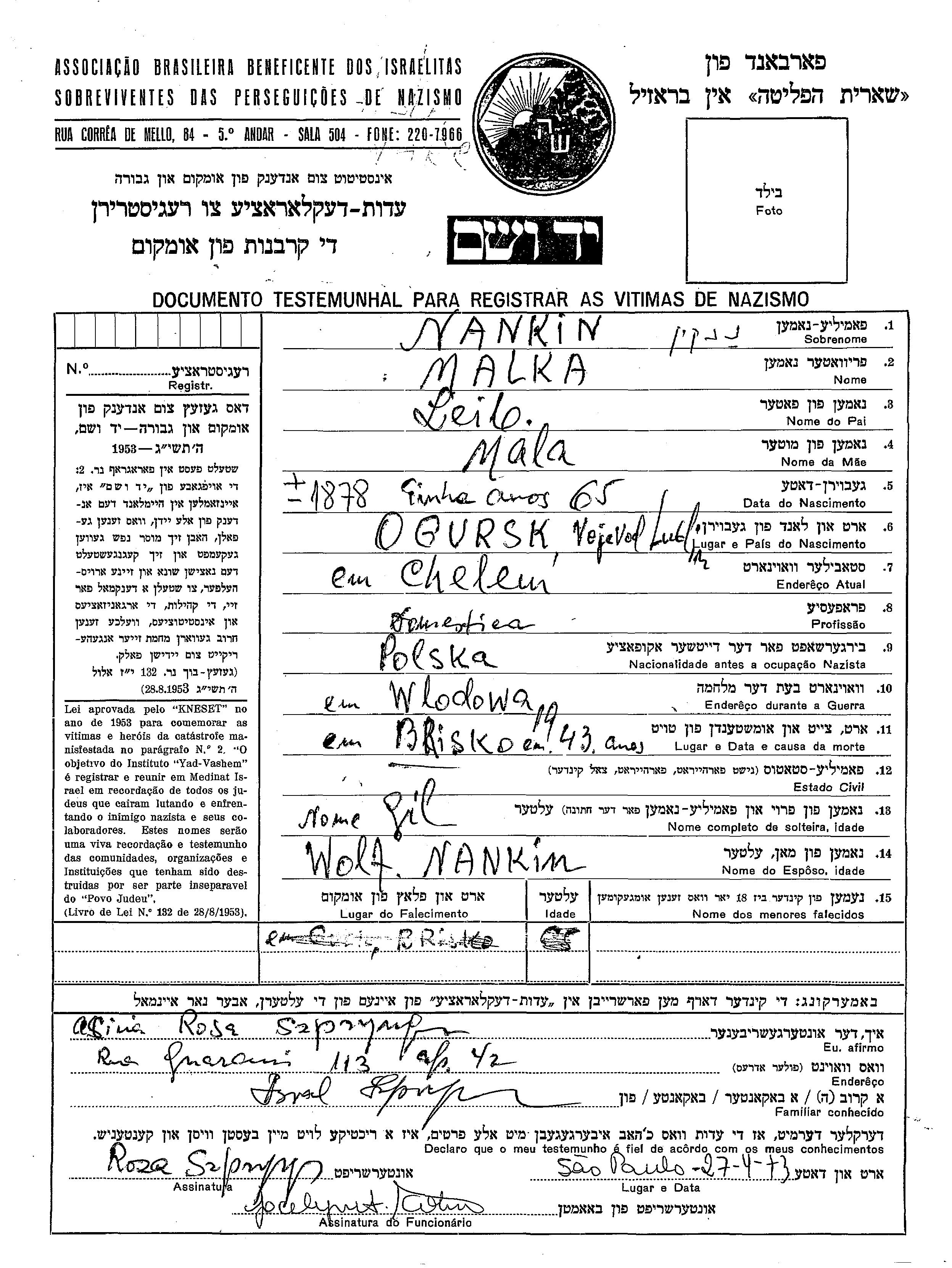 Malka Nankin, geb. Gil wurde im Jahr 1878 in Ogrusk, Polen geboren. Sie war die Tochter von Leib und Mala. Sie war Hausangestellte. Vor dem Zweiten Weltkrieg lebte sie in Chelem, Polen. Während des Krieges war sie in Wlodowa, Polen.
