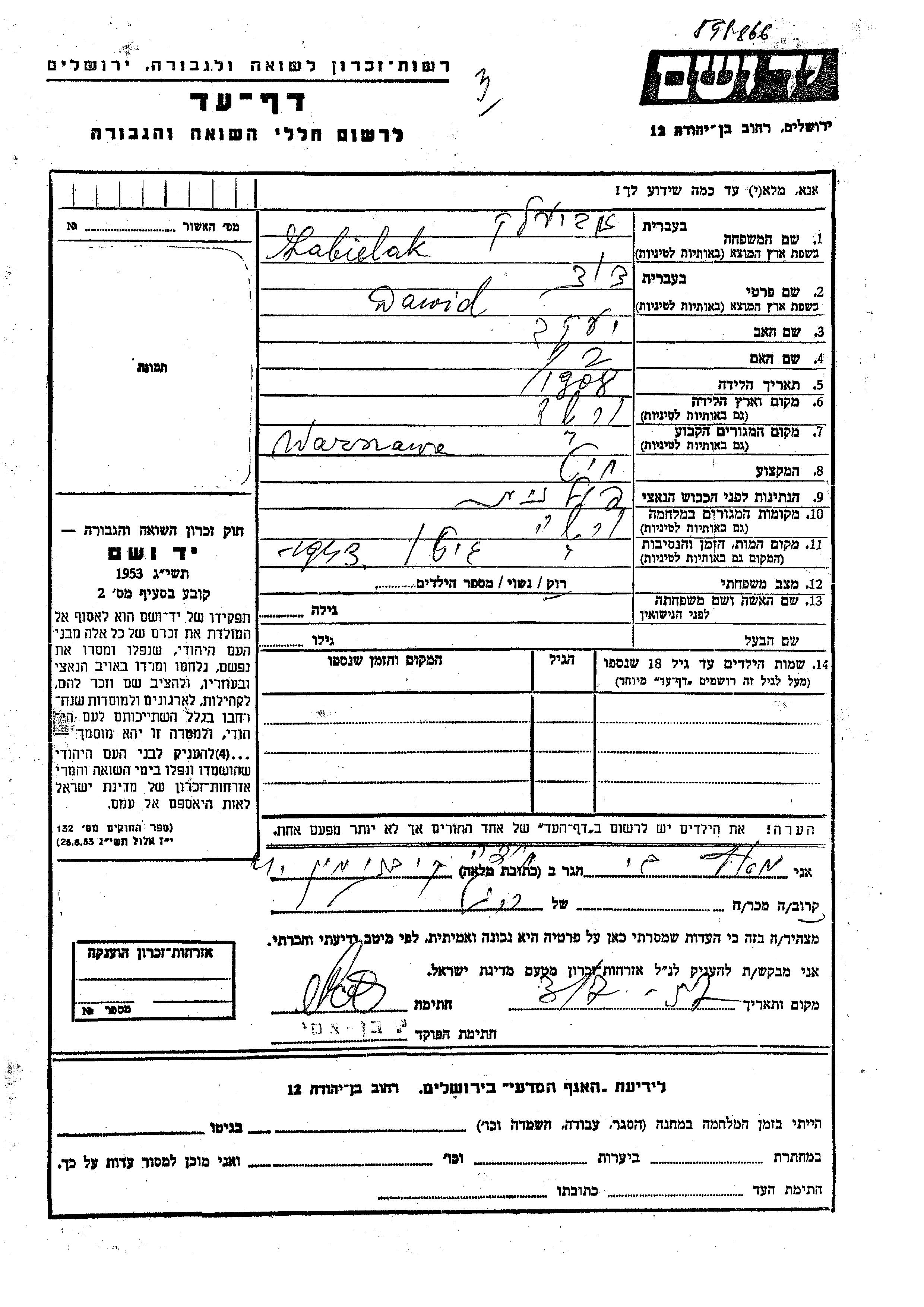 Dawid Zabielak wurde im Jahr 1908 in Warszawa, Polen geboren. Er war der Sohn von Yaakov. Er war Schneider und Ledig. Vor dem Zweiten Weltkrieg lebte er in Warszawa, Polen. Während des Krieges war er in Warszawa, Polen.