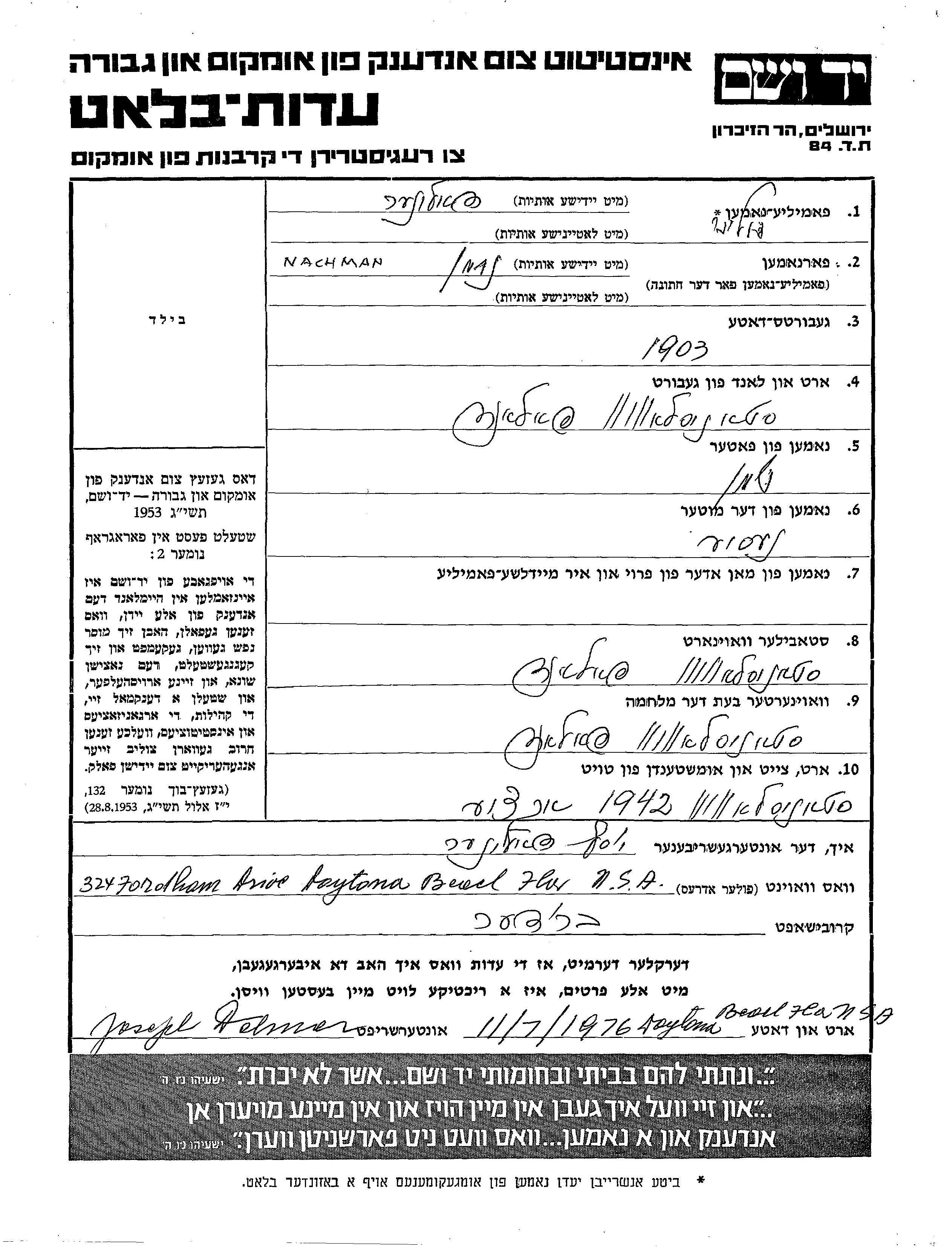 Nachman wurde in der Schoah ermordet. Todesort: Stanislaw, Polen im Jahr 1942.