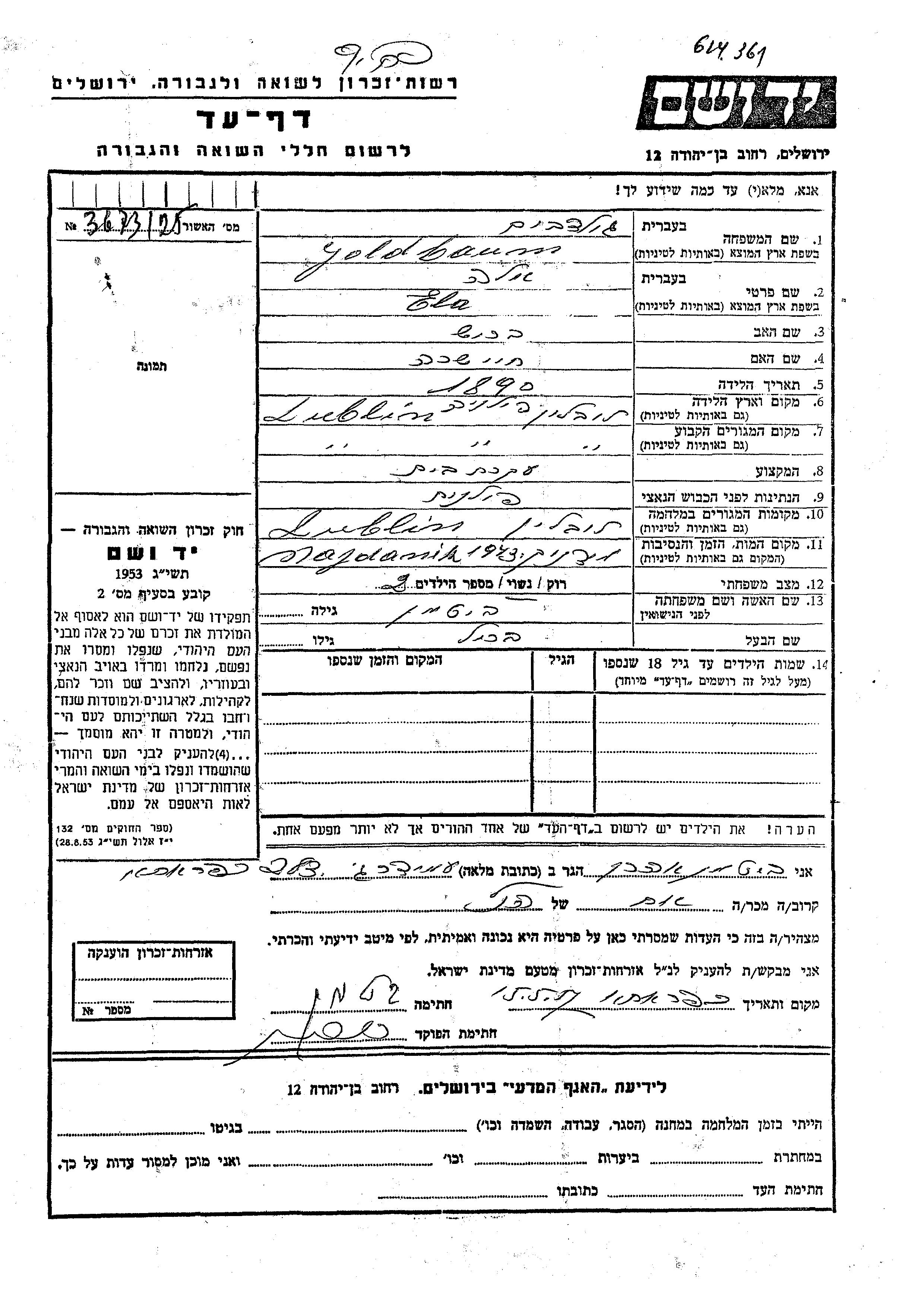 Ela Goldbaum, geb. Bitman wurde im Jahr 1890 in Lublin, Polen geboren. Sie war die Tochter von Berish und Khai Sara. Sie war Hausfrau und mit Beril Verheiratet. Vor dem Zweiten Weltkrieg lebte sie in Lublin, Polen. Während des Krieges war sie in Lublin, Polen.