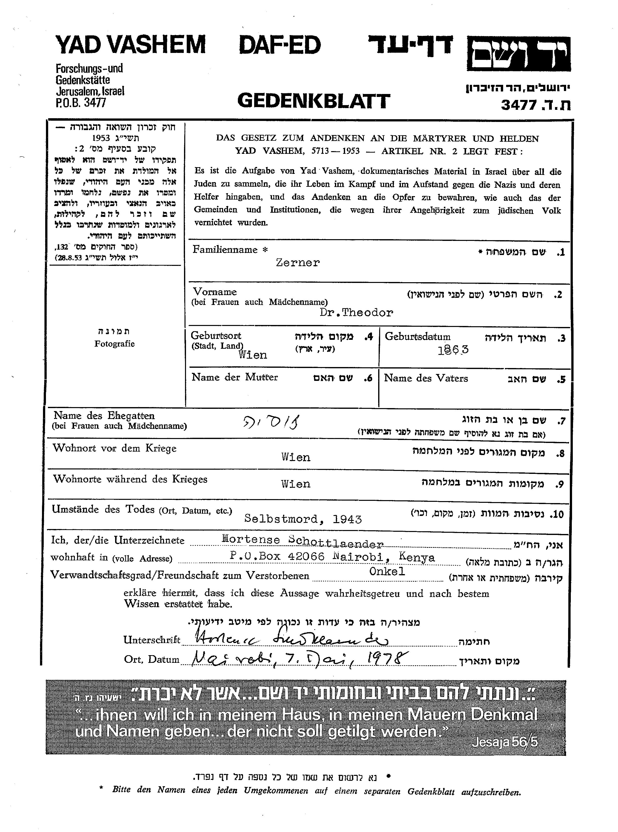 Dr. Theodor Zerner wurde im Jahr 1863 in Wien, Österreich geboren. Er war mit Zusia Verheiratet. Vor dem Zweiten Weltkrieg lebte er in Wien, Österreich. Während des Krieges war er in Wien, Österreich.