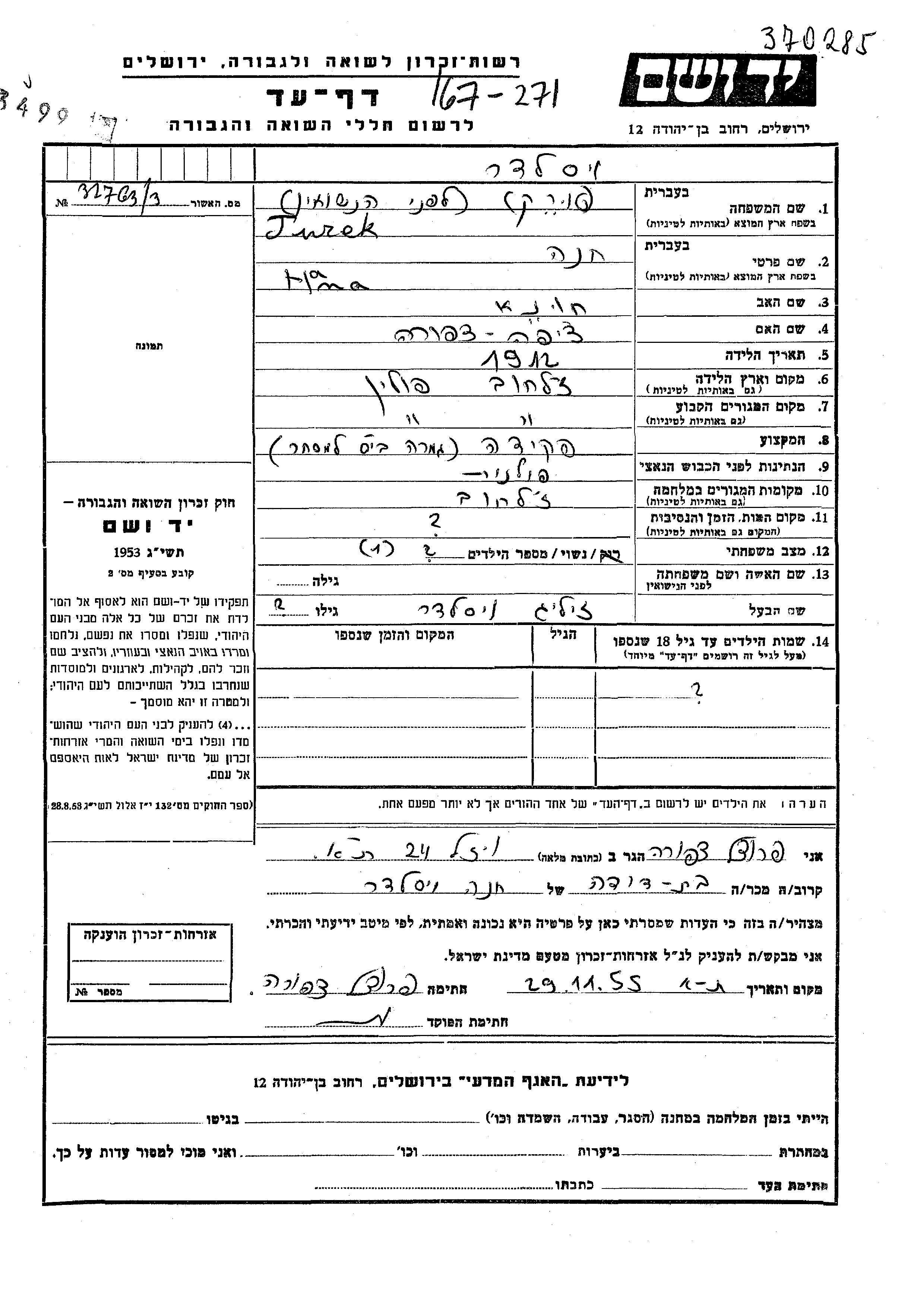 Hana Veisleder, geb. Turek wurde im Jahr 1912 in Zelechow, Polen geboren. Sie war die Tochter von Khuna und Tzipa. Sie war Angestellte/-r und mit Zelig Verheiratet. Vor dem Zweiten Weltkrieg lebte sie in Zelechow, Polen. Während des Krieges war sie in Zelechow, Polen.