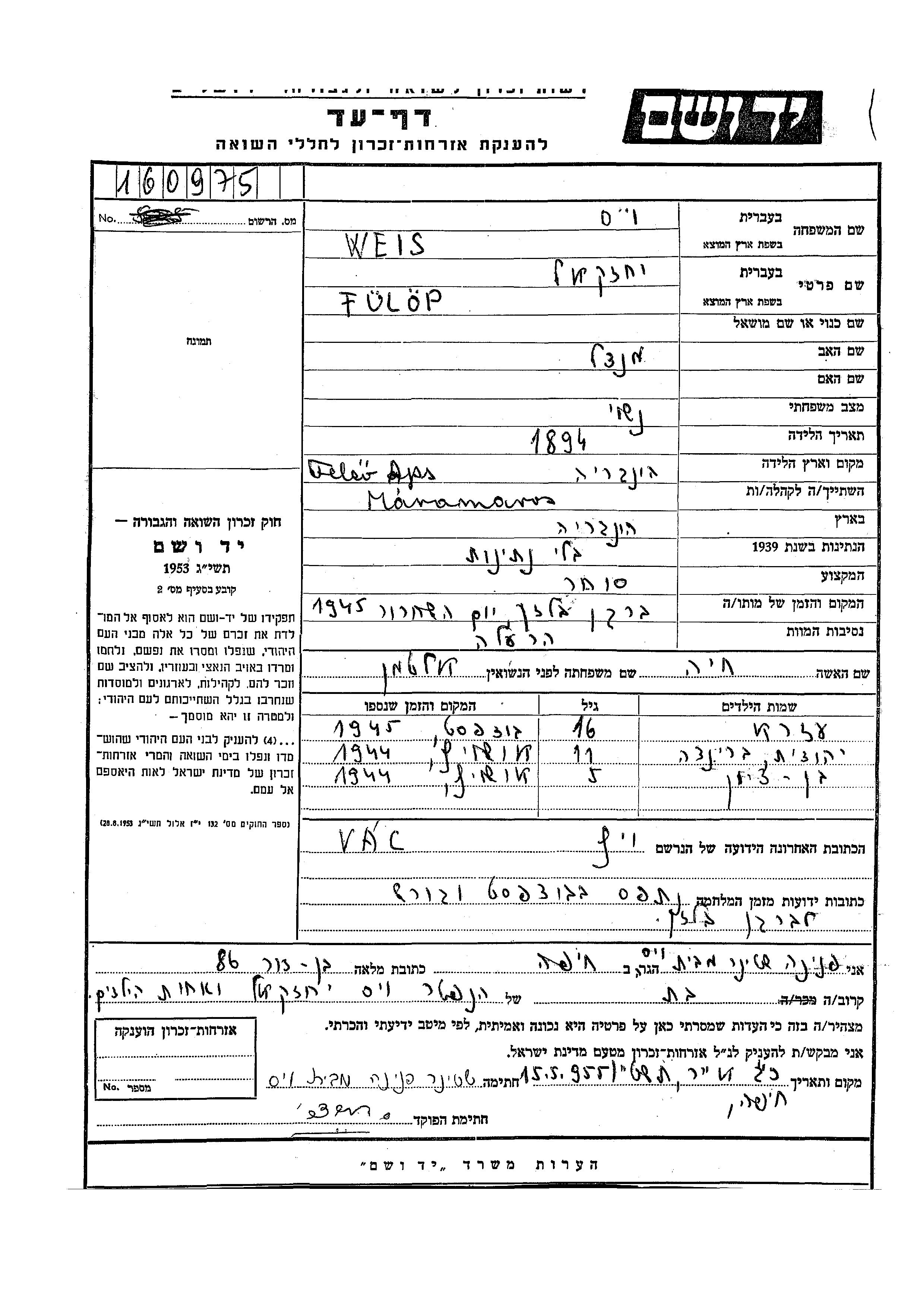 Fulop Yekhezkel Weis wurde im Jahr 1894 in Felsoapsa, Tschechoslowakei geboren. Er war der Sohn von Mendel. Er war Kaufmann/-frau und mit Khaia, geb. Koltman Verheiratet. Vor dem Zweiten Weltkrieg lebte er in Vac, Ungarn. Während des Krieges war er in Bergen Belsen, Deutsches Reich.