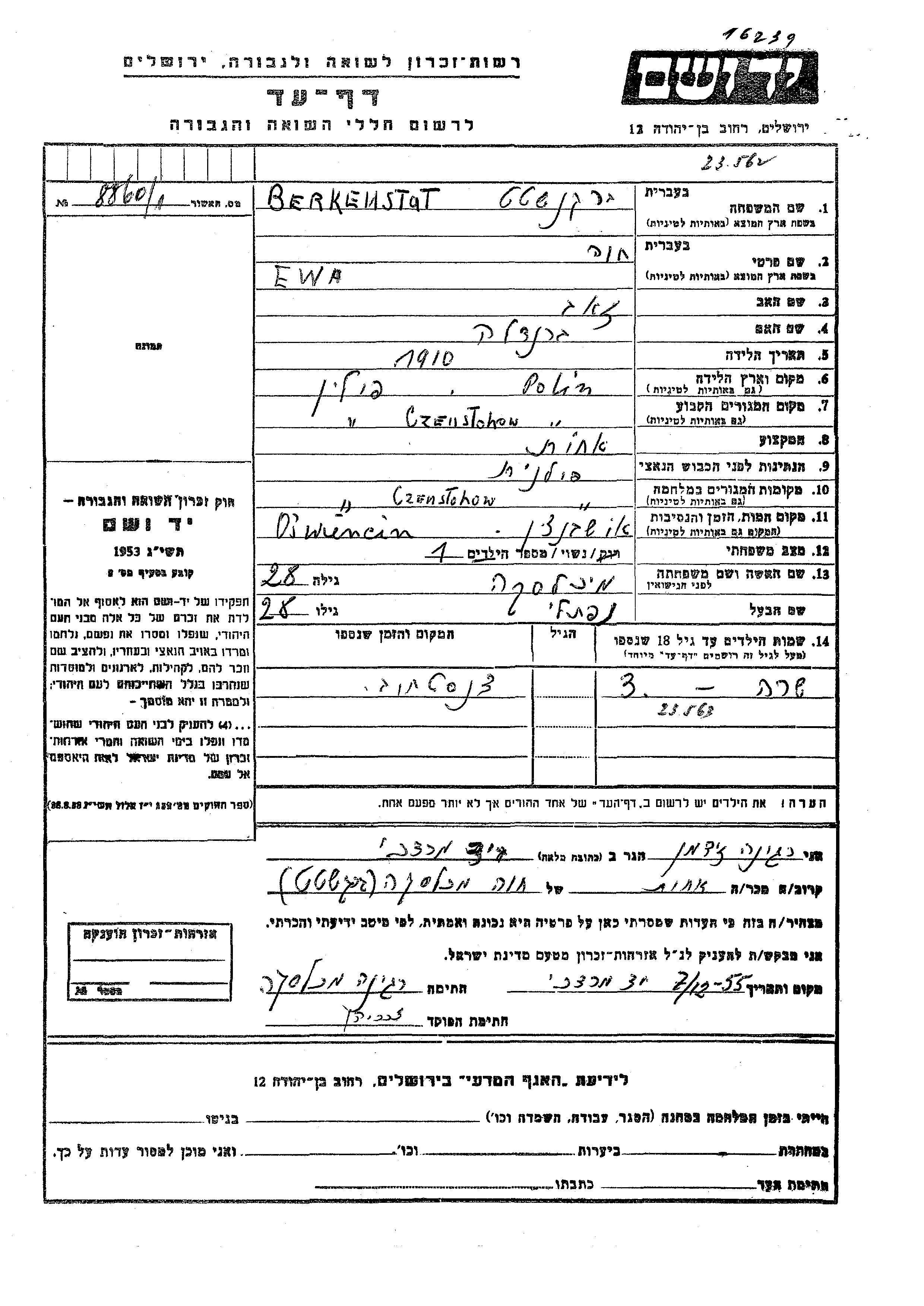 Ewa Khava Berkenstat, geb. Mikhalski wurde im Jahr 1910 in Polen geboren. Sie war die Tochter von Zeev und Breina. Sie war Krankenpfleger/-in und mit Naftali Verheiratet. Vor dem Zweiten Weltkrieg lebte sie in Czestochow, Polen. Während des Krieges war sie in Czestochow, Polen.