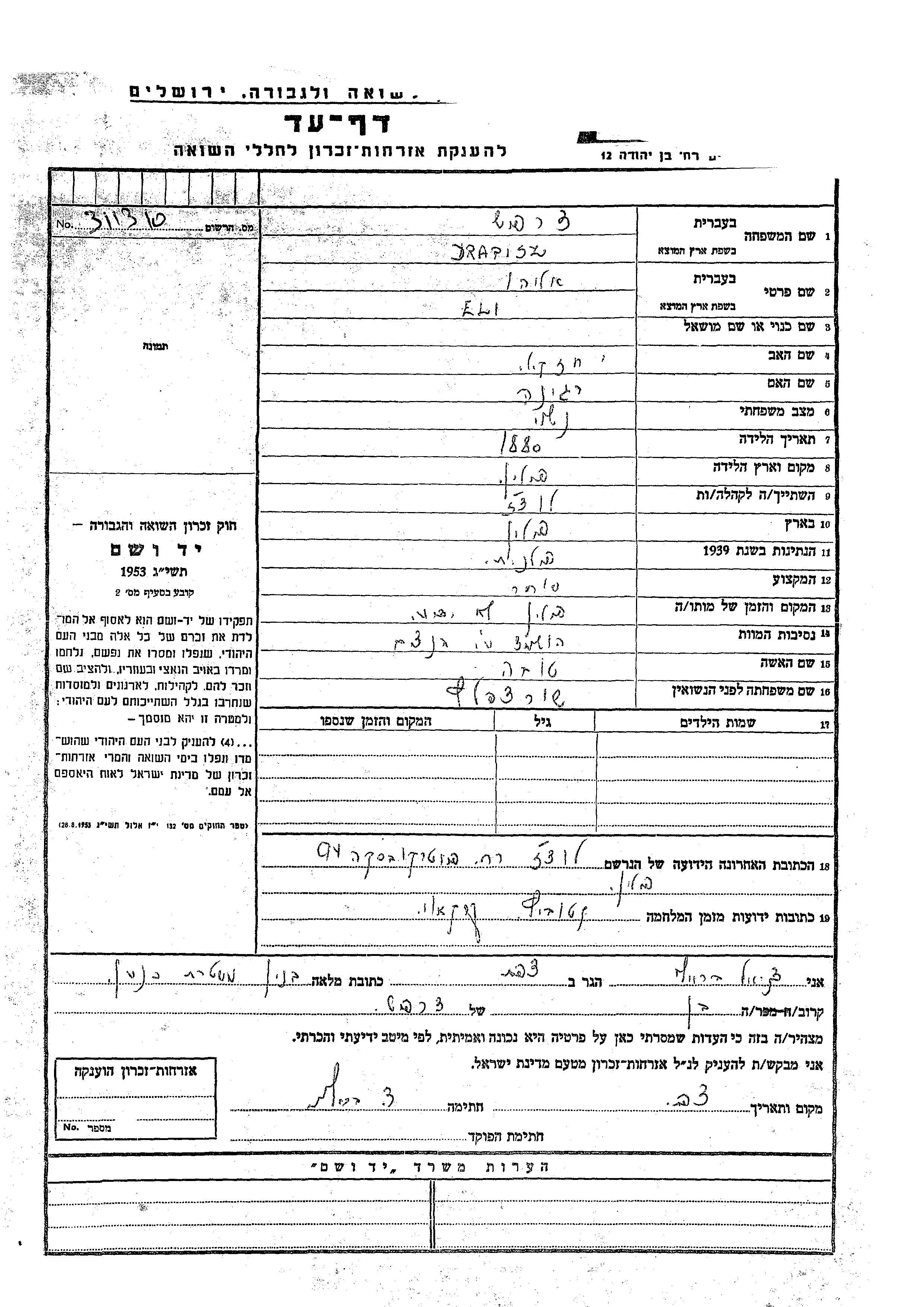 Eli Eliahu Drapisz wurde im Jahr 1880 in Polen geboren. Er war der Sohn von Yekhezkel und Regina. Er war Kaufmann/-frau und mit Tova, geb. Shvartzpeltz Verheiratet. Vor dem Zweiten Weltkrieg lebte er in Lodz, Polen. Während des Krieges war er in Krakow, Polen.