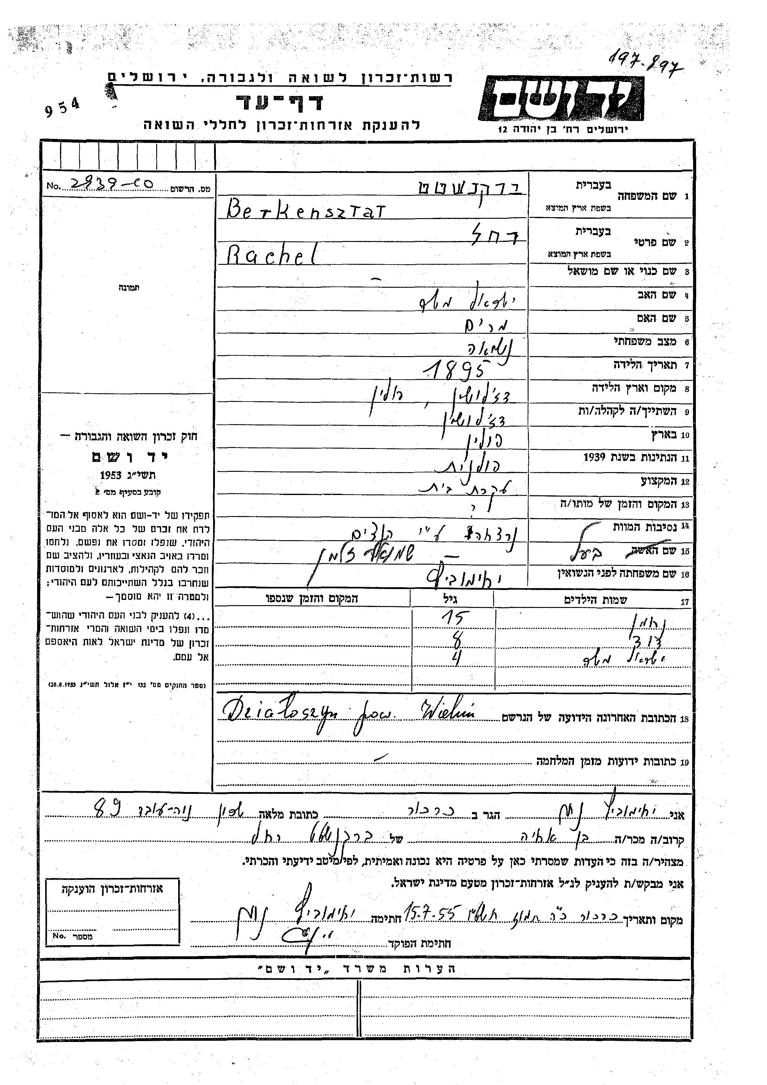 Rachel Berkensztat, geb. Iakhimovitz wurde im Jahr 1895 in Dzialoszyn, Polen geboren. Sie war die Tochter von Yisrael Moshe und Miriam. Sie war Hausfrau und mit Shmuel Zalman Verheiratet. Vor dem Zweiten Weltkrieg lebte sie in Dzialoszyn, Polen. Während des Krieges war sie in Polen.